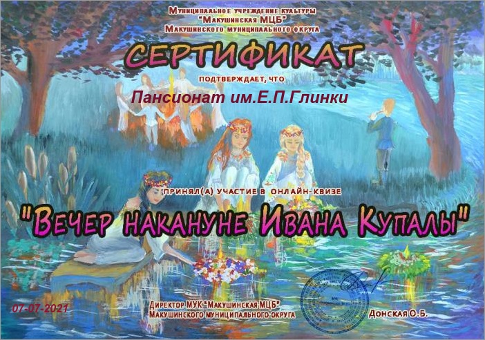Жители Пансионата поучаствовали онлайн-квизе "Вечер накануне Ивана Купалы", где проявили себя знатоками народных традиций и заслуженно были отмечены сертификатом.