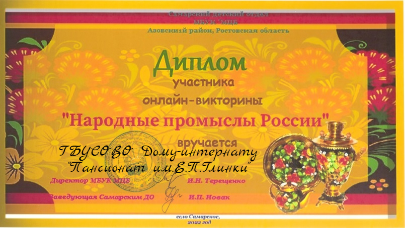 В рамках благотворительного марафона «Живи ярко-делай добро!», библиотечный центр «Интеллект» провел онлайн вечер «Для души и от души» для жителей пансионата им.Е.П.Глинки. Вечер посвящен Году культурного наследия народов России, а именно Владимирской области, ее материальной и нематериальной культуре. Заочное путешествие-презентацию провела заведующая отделом обслуживания Татьяна Смирнова. На таких мероприятиях видна сразу равная отдача, потому что это сделано для души и от души. Жители пансионата узнали много нового и интересного, а так же поучаствовали в онлайн- викторине»Народные промыслы России», за что были отмечены дипломом.