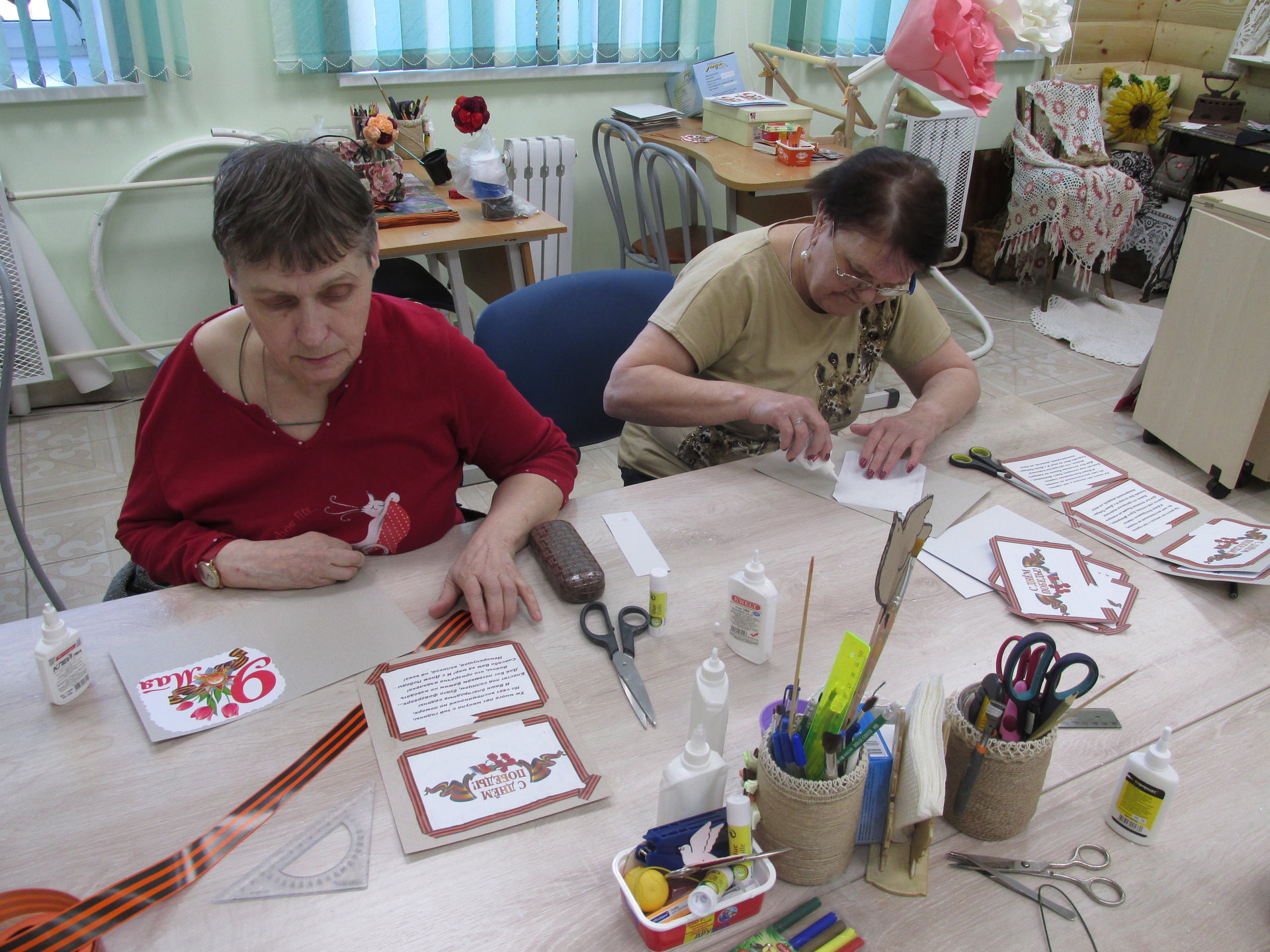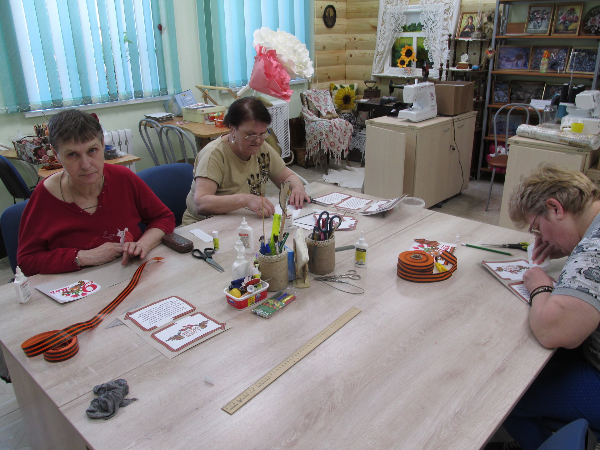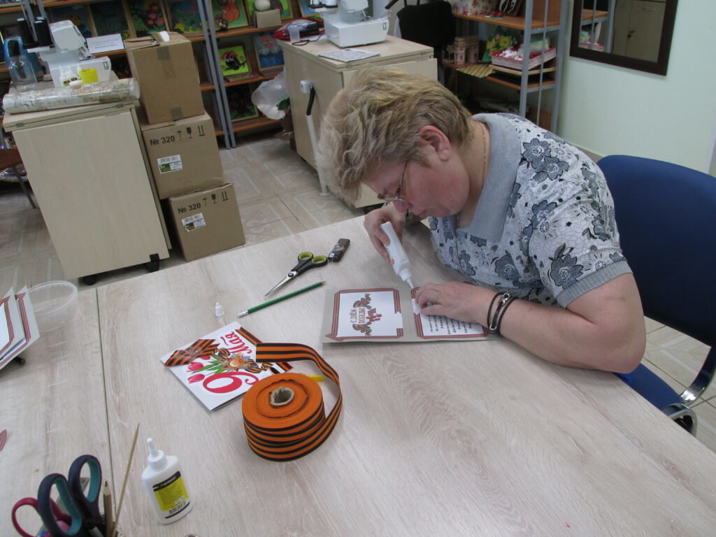 В Вязниковском Пансионате началась активная подготовительная работа к празднованию Великой Победы, чествованию ветеранов и детей войны. Первые шаги по направлению к главному празднику сделаны в студии прикладного творчества. Подарок ветерану должен быть особенным, поэтому делать его нужно своими руками. Мастерицы с удовольствием принялись за изготовление поздравительных открыток: разработали дизайн, вооружились ножницами и клеем, и, засучив рукава, дружно взялись за дело.