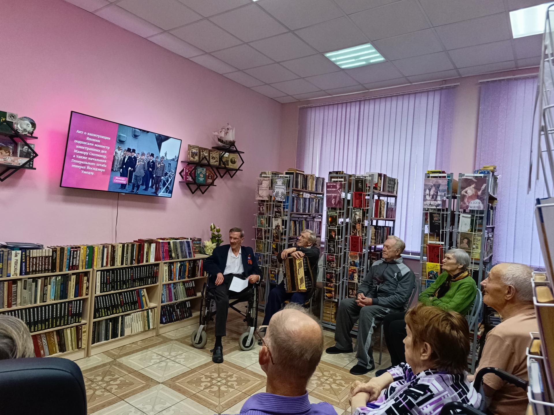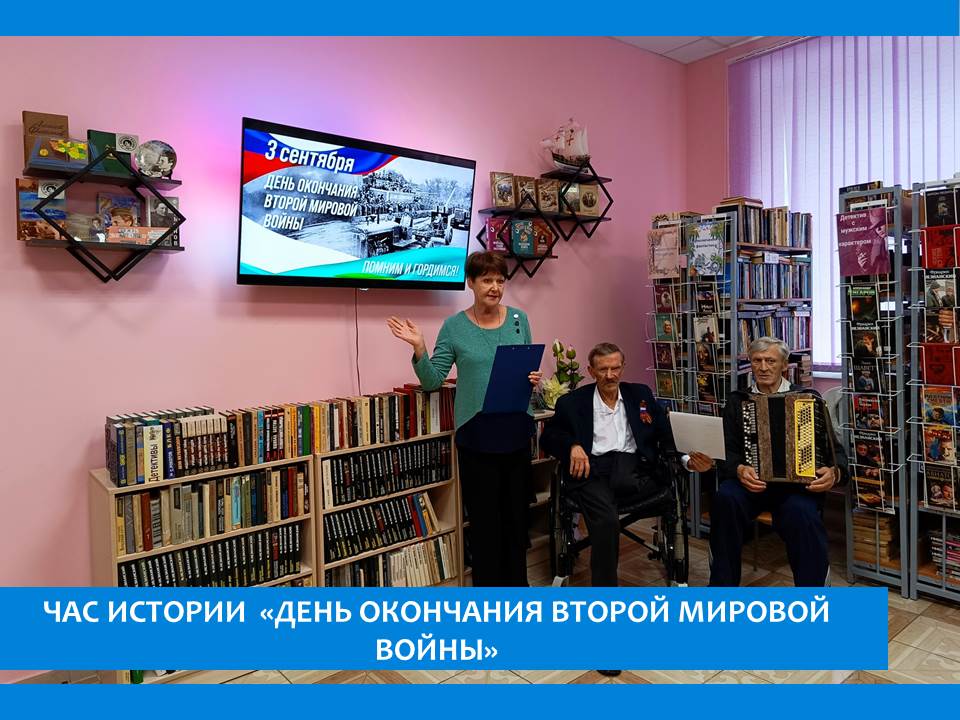 3 сентября для жителей пансионата был проведен час истории, посвященный окончанию второй мировой войны. Была оформлена выставка «Вторая мировая война». В ходе мероприятия, участники вспомнили о самой крупной в истории человечества войне, о тех героях кто воевал и не вернулся с войны, кто жил в оккупации, боролся за жизнь и смог выжить в те тяжелые годы.