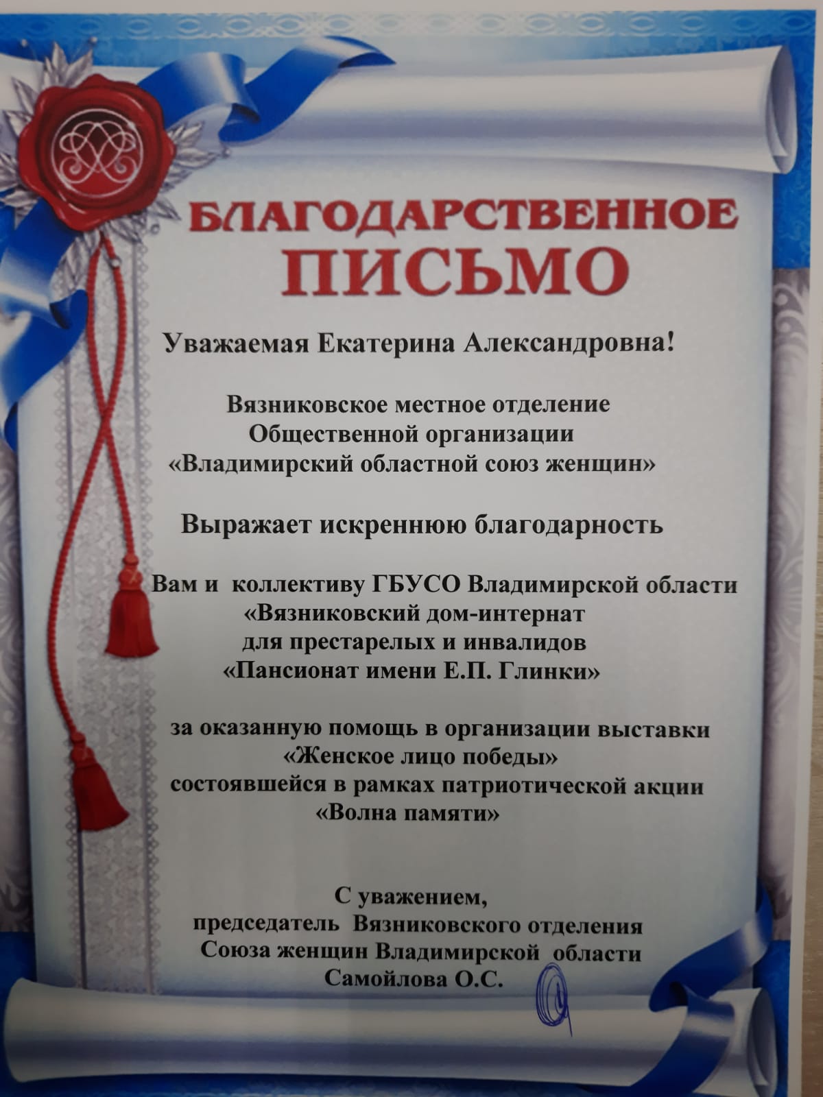 23 сентября 2021 года  в ИПБЦ «Интеллект» состоялось торжественное подведение итогов патриотической акции «Волна Памяти». Акция была объявлена в феврале Общественной организацией «Владимирский областной союз женщин». Проживающие Вязниковского Пансионата имени Е.П. Глинки активно участвовали  в создании и организации выставки «Женское лицо Победы», проводимой в рамках акции, за что были награждены Благодарственным письмом.