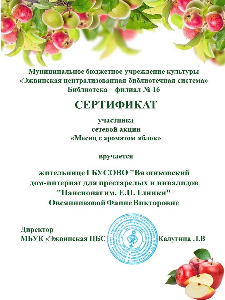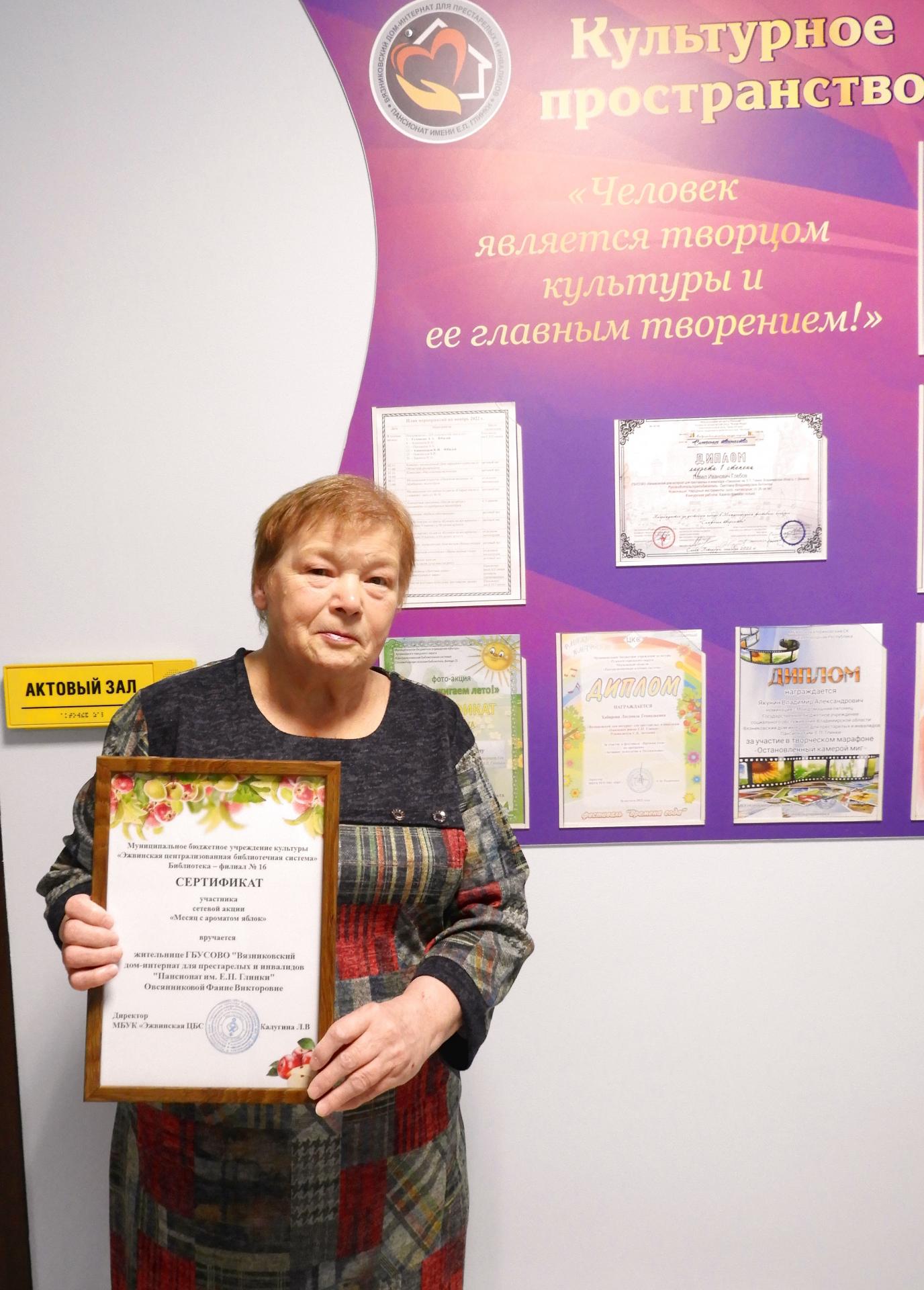 Жительница Вязниковского Пансионата – Овсянникова Фаина Викторовна совсем недавно проживает в Пансионате. Поступила она в июле в тяжёлом состоянии, а в октябре – уже активно принимала участие в различных мероприятиях. Совсем недавно стала участницей социального проекта «Бабушка на час», где прекрасно справилась со всеми задачами проекта –  провела время с ребёнком, пока мама занималась домашними делами. Фаина Викторовна любит посещать актовый зал и библиотеку Пансионата, где проходят тематические вечера, концерты, викторины и т.д.  А совсем недавно стала участницей сетевой акции «Месяц с ароматом яблок». И вот, награда – первый сертификат участника сетевой акции! То ли ещё будет!  Мы желаем Фаине Викторовне не останавливаться на достигнутом, и пусть успех ждёт её во всех начинаниях.