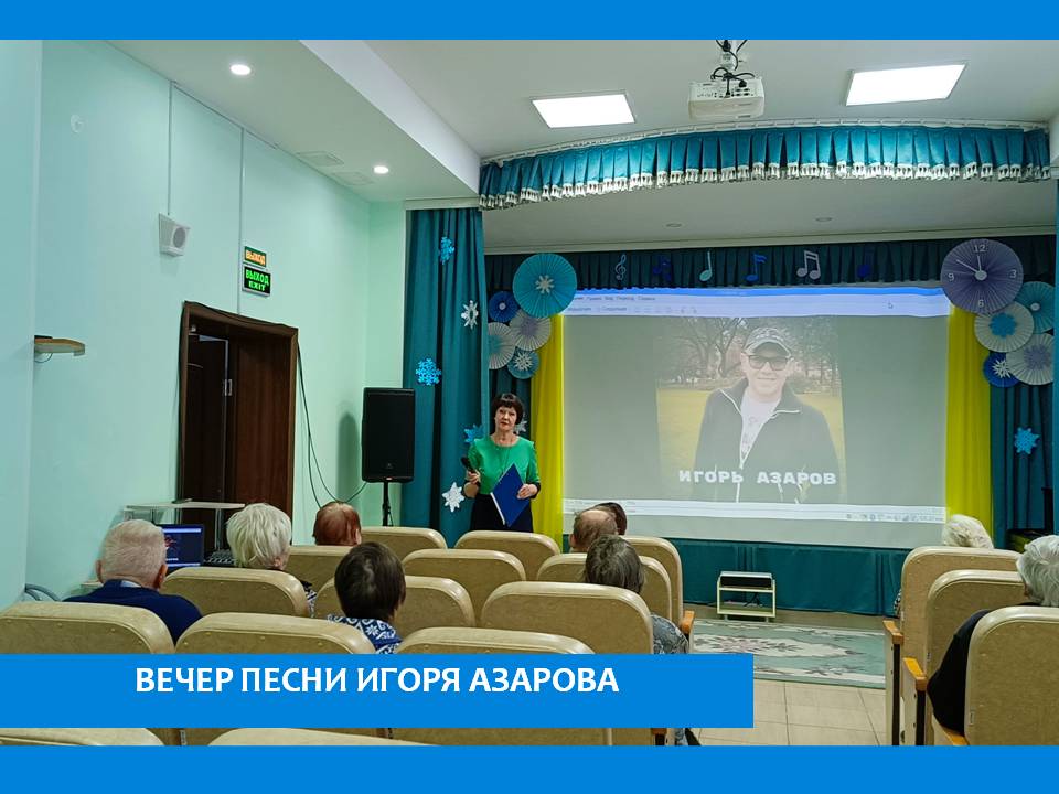 Так уж совпало что уже третий вечер проходящий под рубрикой "Наши композиторы и поэты» посвящается героям, чья жизнь и творчество неразрывно связаны с городом на Неве. Но если имена Александра Колкера и Игоря Корнелюка до сих пор на слуху, то имя Игоря Азарова затерялось где-то в 90-х, а между тем известных и популярных песен он в своё время написал немало, это и «Мост качается», «Дом на горе», «Ну зачем мне этот вечер без тебя», «Карусель», а некоторые из этих песен он же сам и исполнил, поэтому Игорь известен и как исполнитель своих песен. Участники вечера наслаждались песнями в исполнении Людмилы Сенчиной, Эдиты Пьехи, Ольги Зарубиной, Ирины Понаровской и конечно самого Игоря Азарова.