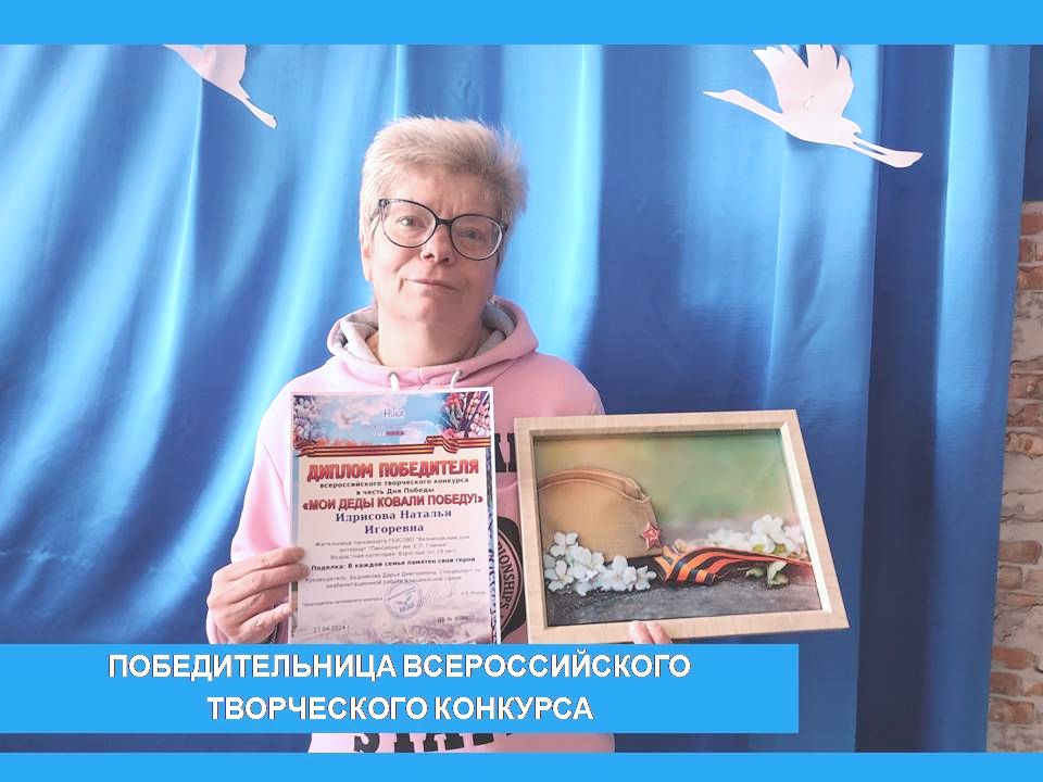 Работа в данной технике «В каждой семье памятен свой герой» отмечена дипломом победителя Всероссийского творческого конкурса в честь Дня Победы «Мои деды ковали победу», проводимого образовательным порталом «НИКА».