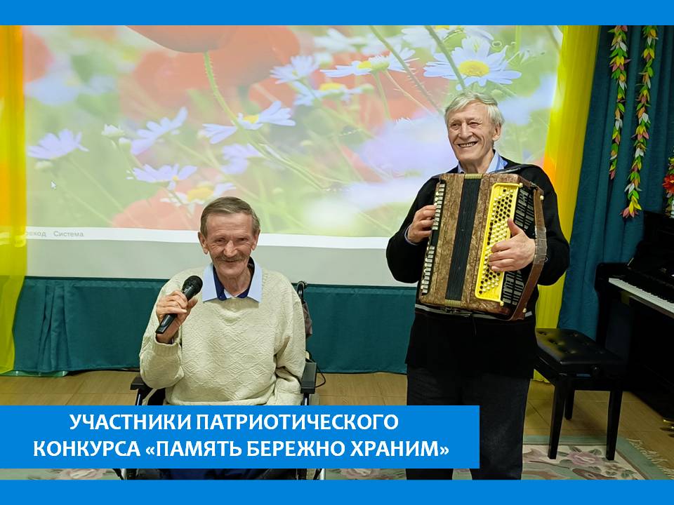 Жители пансионата Павел Глебов и Петр Гаврилов принимают участие в межрегиональном многожанровом патриотическом конкурсе «Память бережно храним», посвященном 79-ой годовщине Победы в Великой Отечественной войне. В номинации вокальное искусство звучит песня Муз.М.Блантера сл.А.Коваленкова «Солнце скрылось за горою» .Организатор МБУК «Хмельницкий ЦКД» Липецкой области.