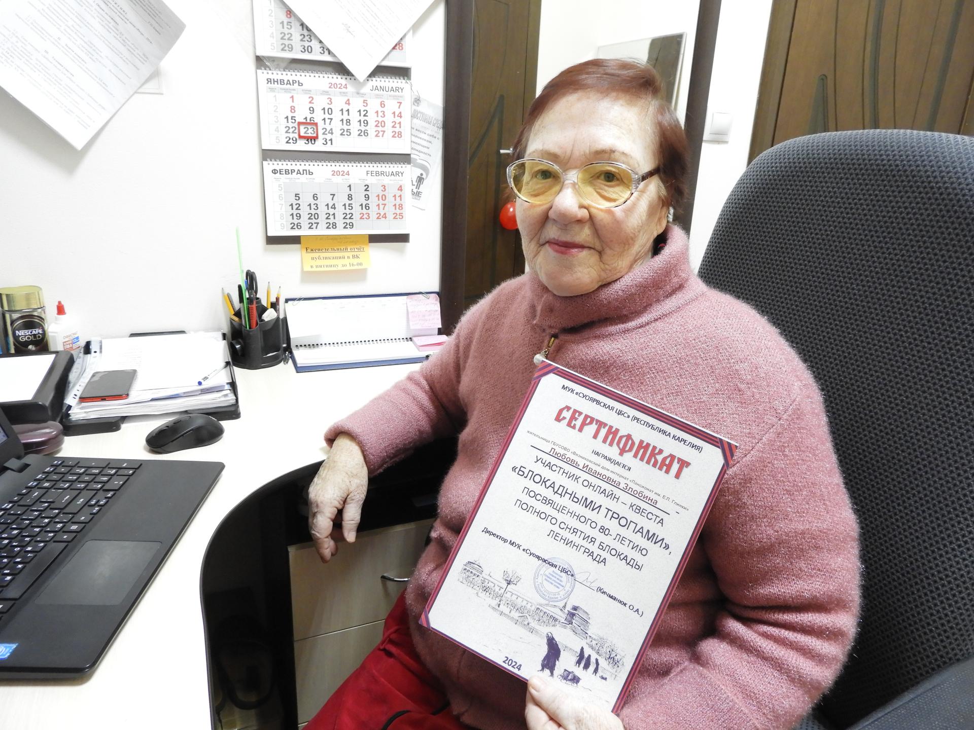 Дань памяти тем страшным событиям отдаём участием в различных тематических мероприятиях. Жительница Вязниковского Пансионата Любовь Ивановна Злобина прошла онлайн-квест «Блокадными тропами», организованный Суоярвской центральной библиотекой (Республика Карелия). Пройдя 5 туров и ответив на все вопросы, Любовь Ивановна получила сертификат.