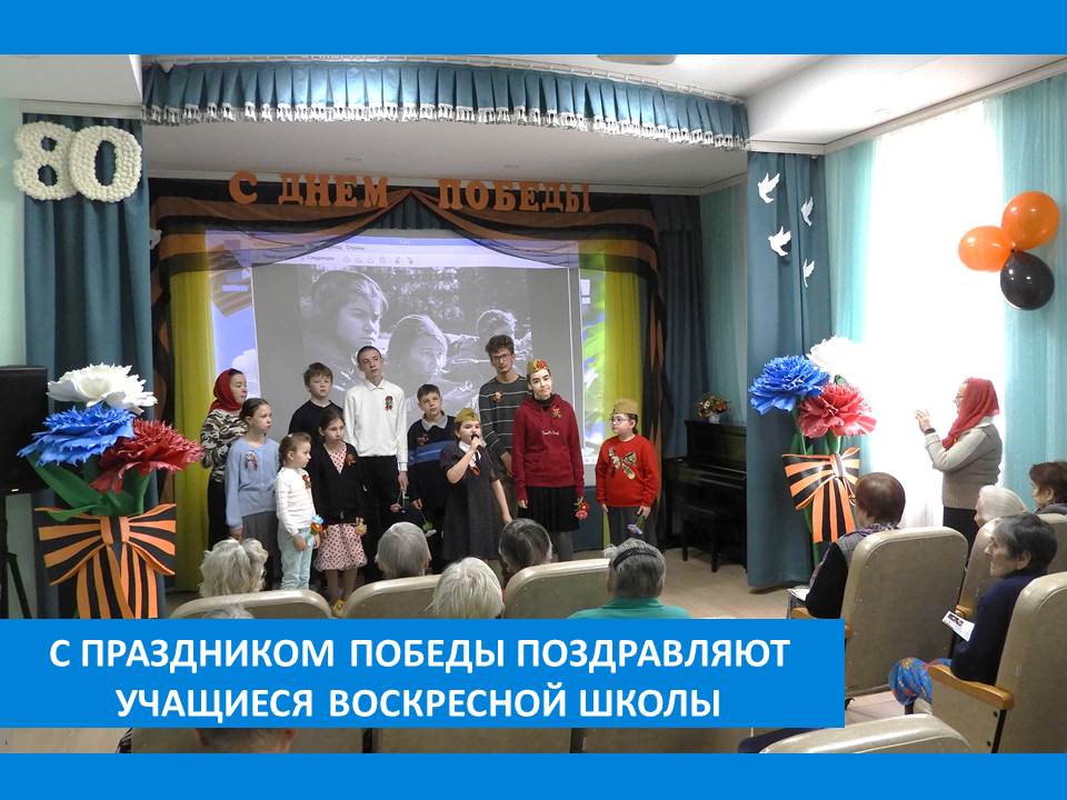 11 мая жители Вязниковского Пансионата принимали у себя в гостях учащихся Воскресной школы Храма Покрова Пресвятой Богородицы. Православная встреча была посвящена праздникам Светлой Пасхи и Великой Победы. Гости представили патриотическую литературно-музыкальную композицию, где песни исполняли всем залом.