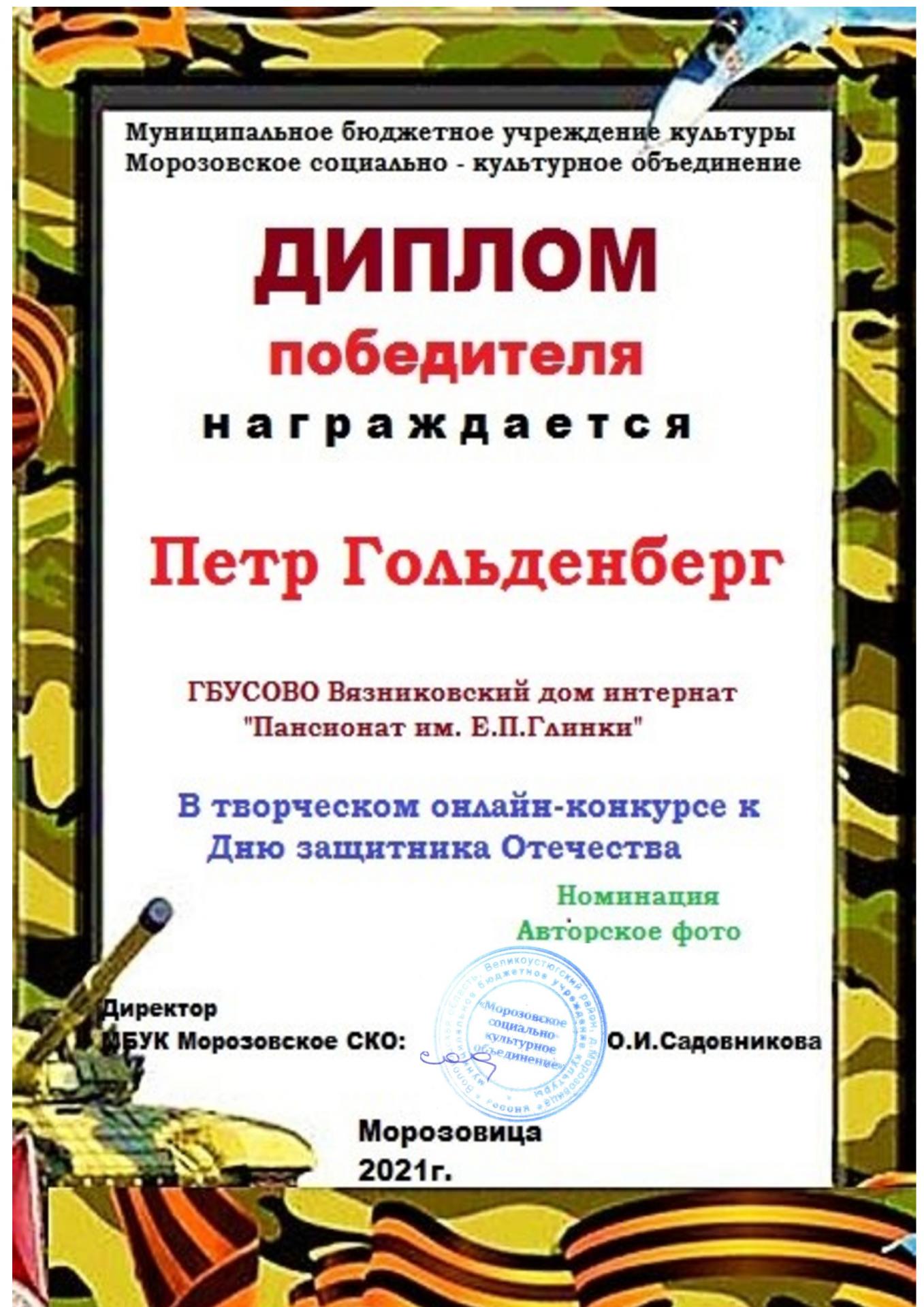 Жители Вязниковского Пансионата являются активными участниками сетевых акций. И вот ещё одна награда в заочном конкурсе, который был организован МБУК Морозовское-Ско Великоустюгского района Вологодской области. Из предложенных номинаций конкурсной программы, были выбраны 2 – это «Авторская фотография» и «Музыкальное творчество». Дипломами победителей награждены жители Пансионата Пётр Гольденберг и Павел Глебов. Поздравляем и желаем дальнейших творческих успехов и побед!!!