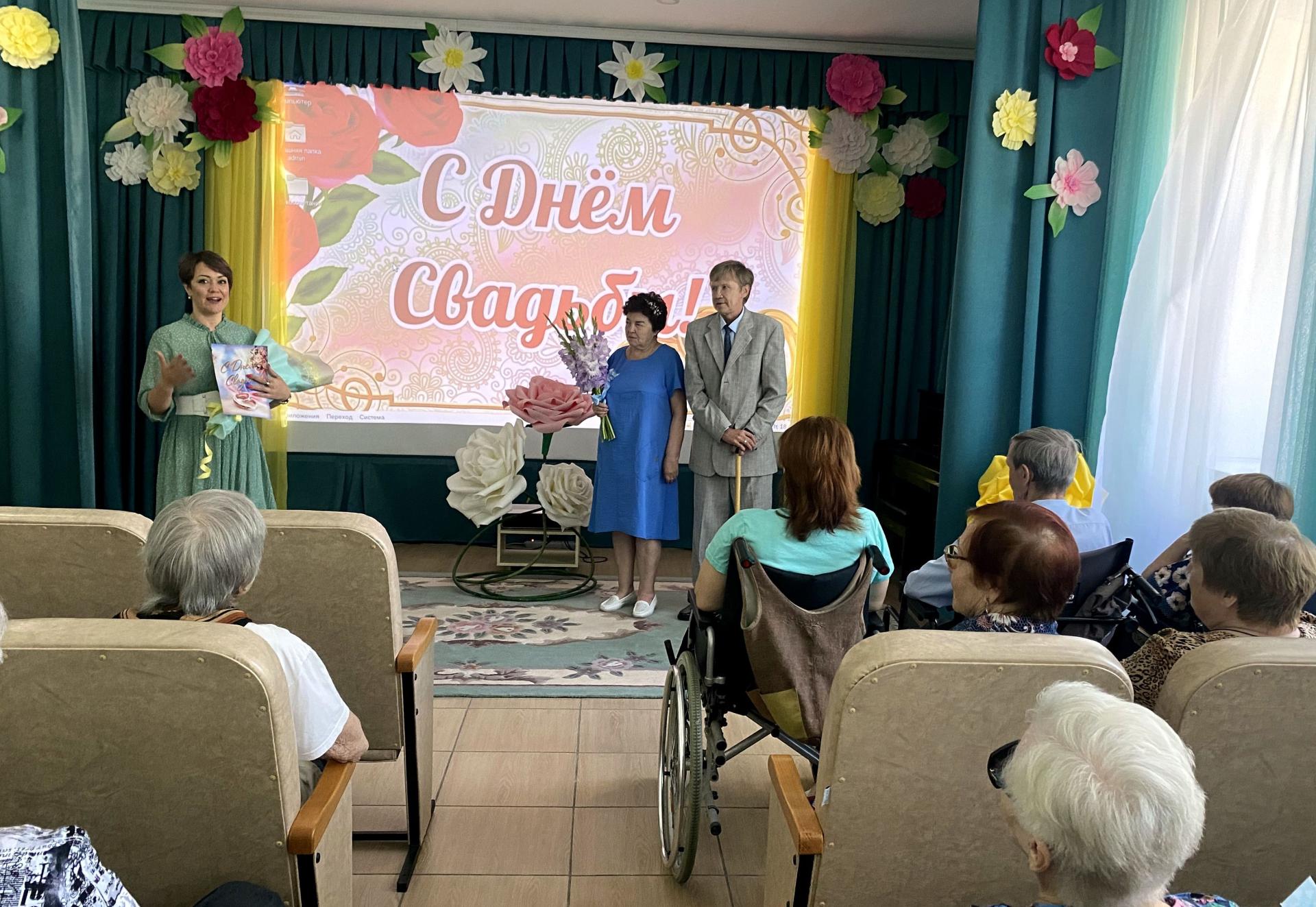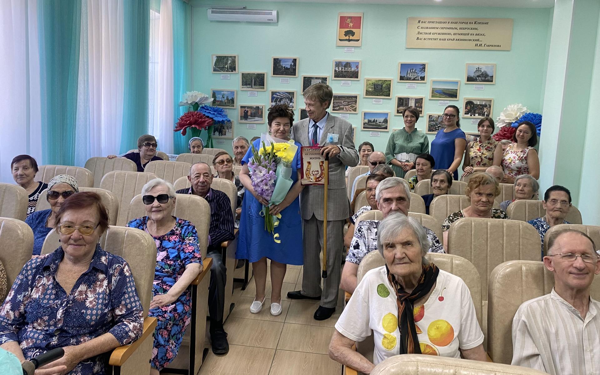 После церемонии бракосочетания, не нарушая традиции, новобрачные посетили главную достопримечательность города – венец, после чего их встречали в Пансионате. Под громкие аплодисменты и музыку новобрачные прошли в актовый зал, где их уже ждали собравшиеся гости. В адрес Константина Евгеньевича и Любови Валентиновны звучали тёплые сердечные поздравления. Директор Пансионата Е.А. Сергеева обратилась с самыми наилучшими пожеланиями любви, здоровья и счастья, и вручила цветы и подарки.