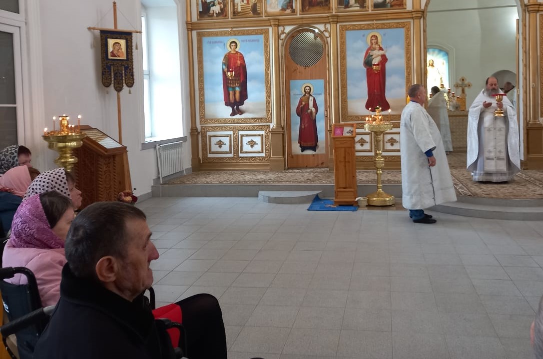 Проживающие Отделения интенсивного ухода Вязниковского Пансионата (с. Сарыево) посетили православное богослужение в местном храме Архангела Михаила для свершения таинства Исповеди и Причастия.