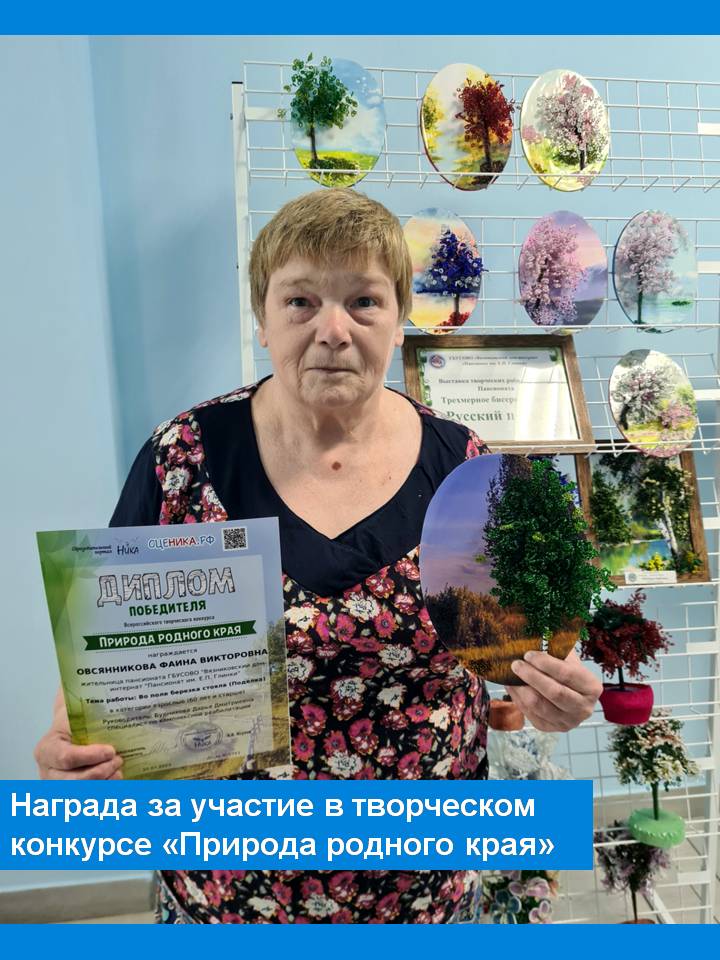 Обладателем диплома победителя Всероссийского творческого конкурса «Природа родного края» стала жительница Вязниковского Пансионата Овсянникова Фаина Викторовна. На конкурс участница представила работу в технике «бисероплетение». Трёхмерное панно с молодой березкой очень точно отобразило природу нашего края. Поздравляем Фаину Викторовну с победой и желаем ей дальнейших успехов и творческого вдохновения!