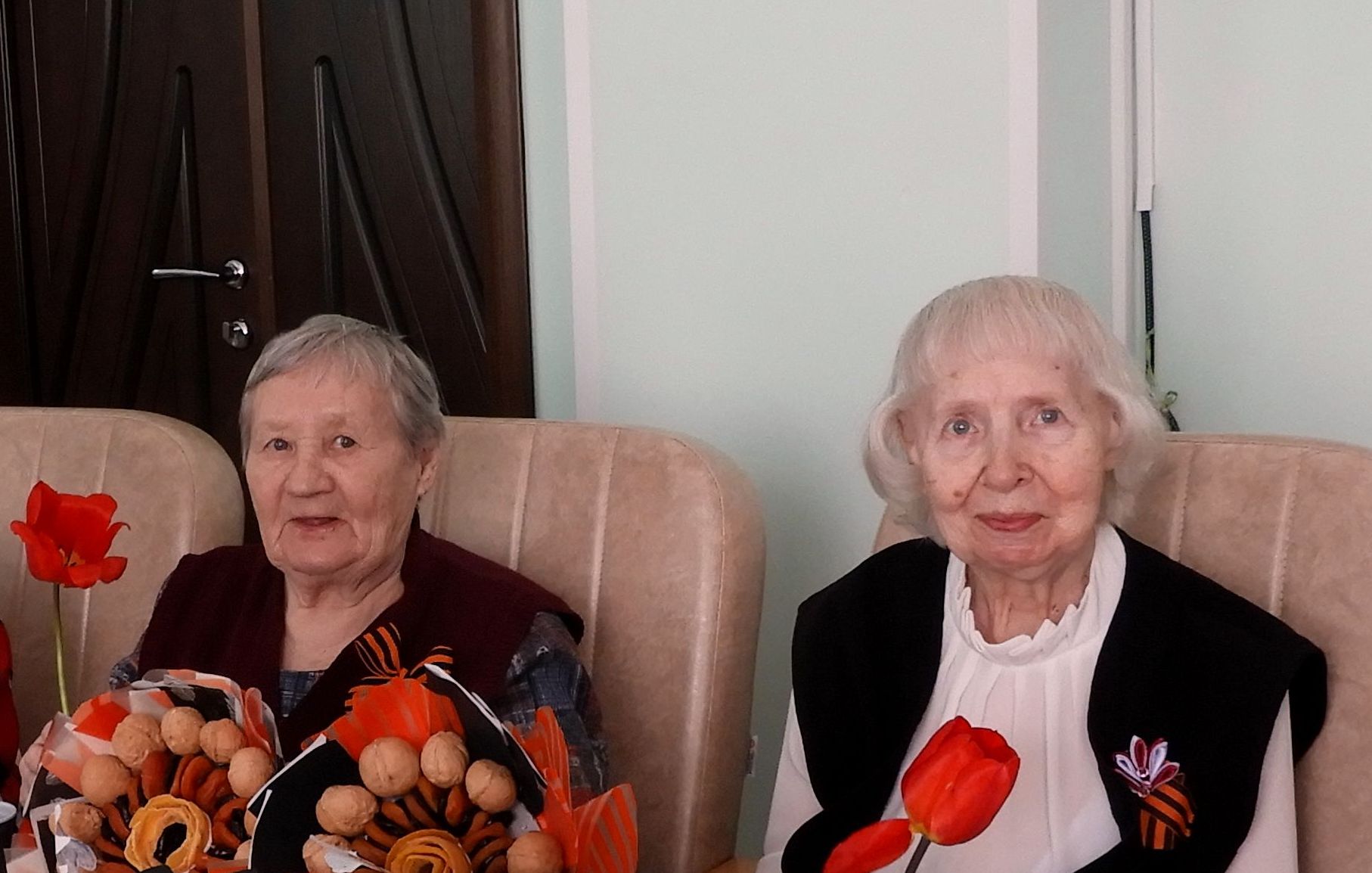 С поздравлением в гости к ветеранам пришли учащиеся Санаторной школы, представив патриотическую музыкально-поэтическую композицию. В завершении встречи ребята преподнесли бабушкам и дедушкам букеты, но не из цветов, а из сухофруктов. Вот такой подарок! И приятный, и полезный!