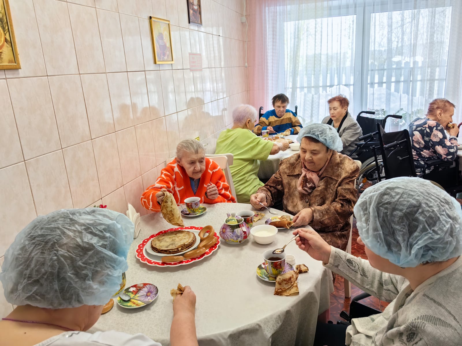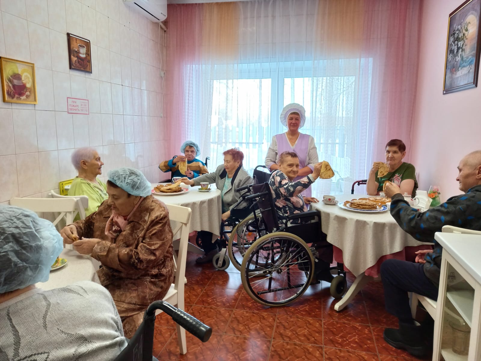 В отделении интенсивного ухода Вязниковского Пансионата (с. Сарыево) провели приятные посиделки «Масленица идёт, блин да мёд несёт» с приготовлением традиционных блинов.