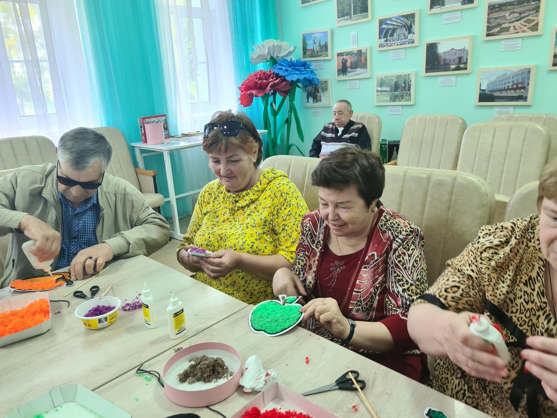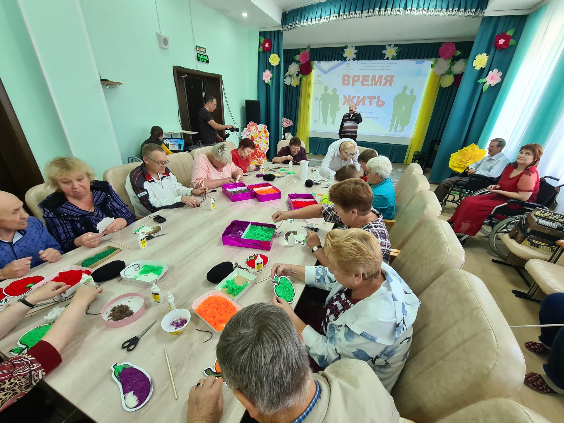 24 августа серебряные волонтеры Пансионата принимали у себя в гостях пожилых граждан станции Сарыево. Официальную часть встречи открыла директор Сергеева Е.А., в которой рассказала об активности проживающих в различных проектах учреждения. Гости просмотрели тематический фильм. А дальше по традиции серебряные волонтеры Пансионата поделились своими умениями на мастер-классе «Дары природы» (техника «ниткографика»).