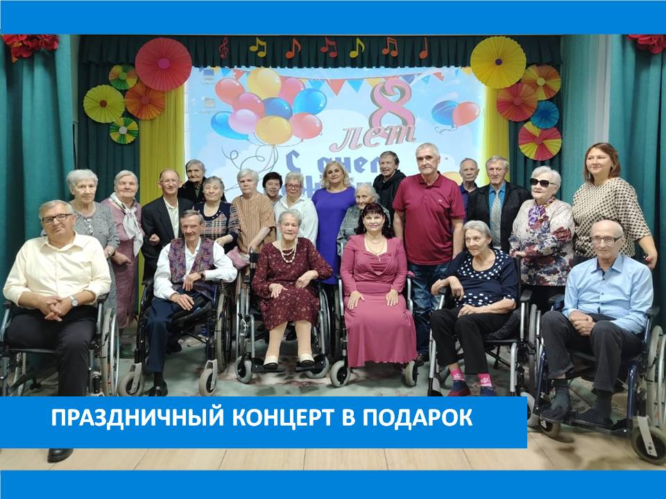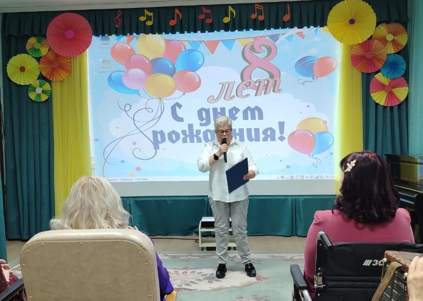 29 сентября в актовом зале прошло праздничное поздравление «Нам – 8!». Всех собравшихся поздравила директор Екатерина Евгеньевна Самойлова, отметив, насколько жизнь в Пансионате с каждым годом становится всё активнее и качественнее – и это есть совместный труд сотрудников и жителей. В подтверждении слов была продемонстрирована презентация, которая напомнила о ярких событиях, прошедших в Пансионате за этот год, отображая всю активную, творческую, разностороннюю деятельность жителей. А серебряные волонтёры Пансионата подарили праздничный концерт, который не оставил равнодушным ни одного человека.
