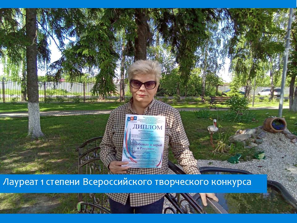 Лауреатом 1 степени Всероссийского творческого конкурса, посвященного Дню России «С любовью и верой в Россию», стала жительница пансионата Наталья Идрисова.
