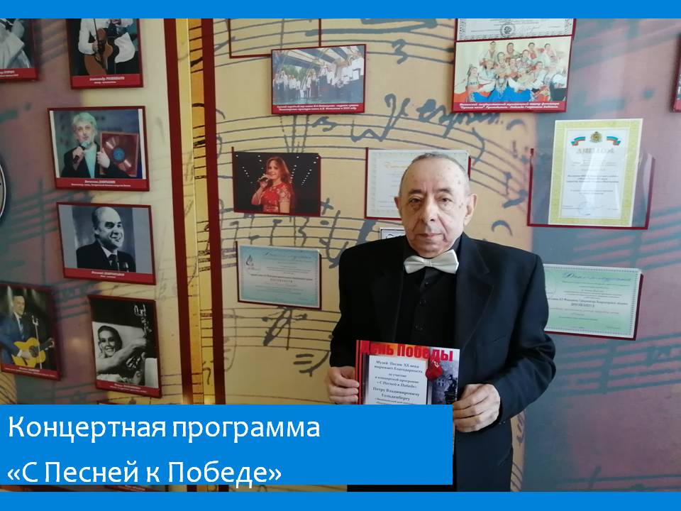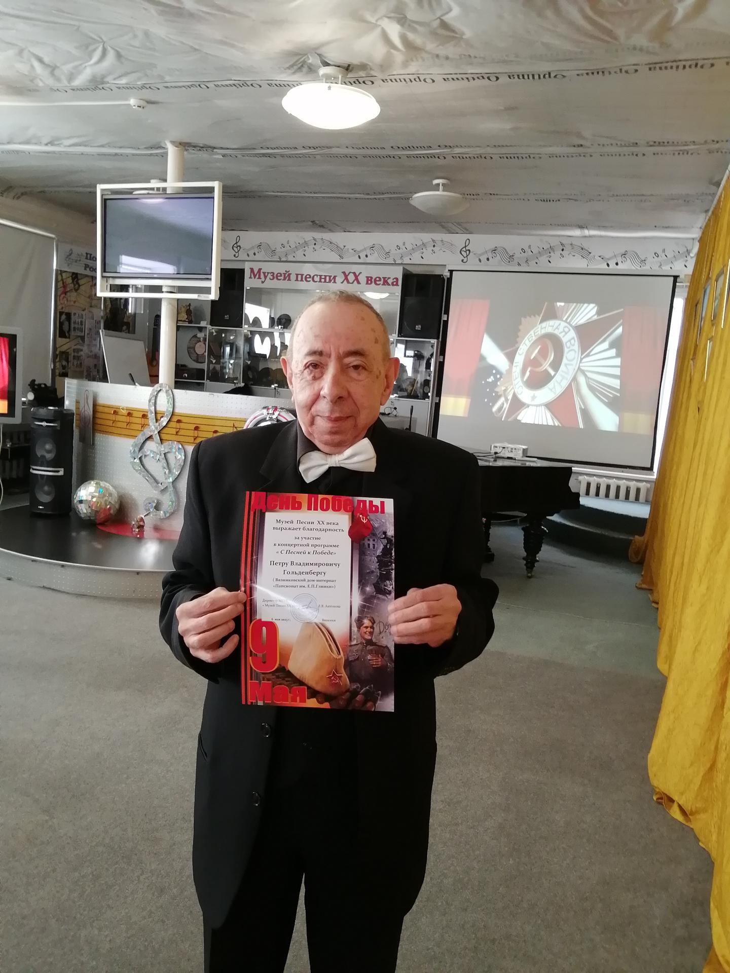 Житель пансионата Пётр Владимирович Гольденберг принял участие в концертной программе «С Песней к Победе», организованной Музеем Песни XX века. В его исполнении прозвучала песня - «Конь» И.Матвиенко на стихи А. Шаганова.