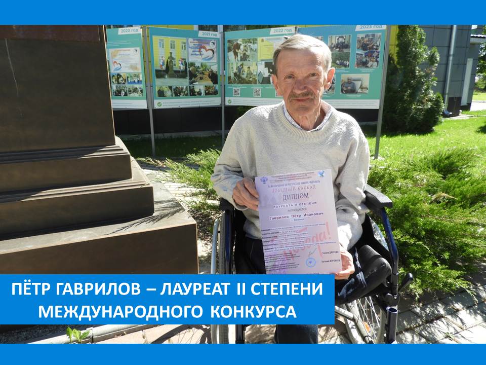 Житель Вязниковского Пансионата Пётр Иванович Гаврилов принял участие в Международном патриотическом конкурсе-фестивале «Победный каскад», организованном при поддержке Российского союза авторов-исполнителей, Министерством культуры РФ и Министерством социальной защиты РФ.