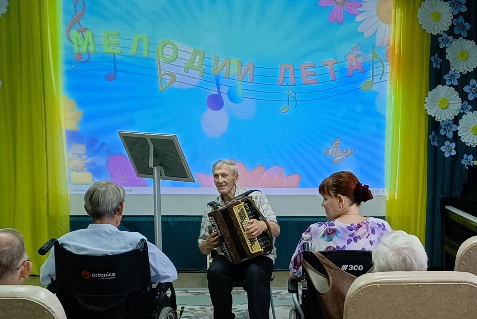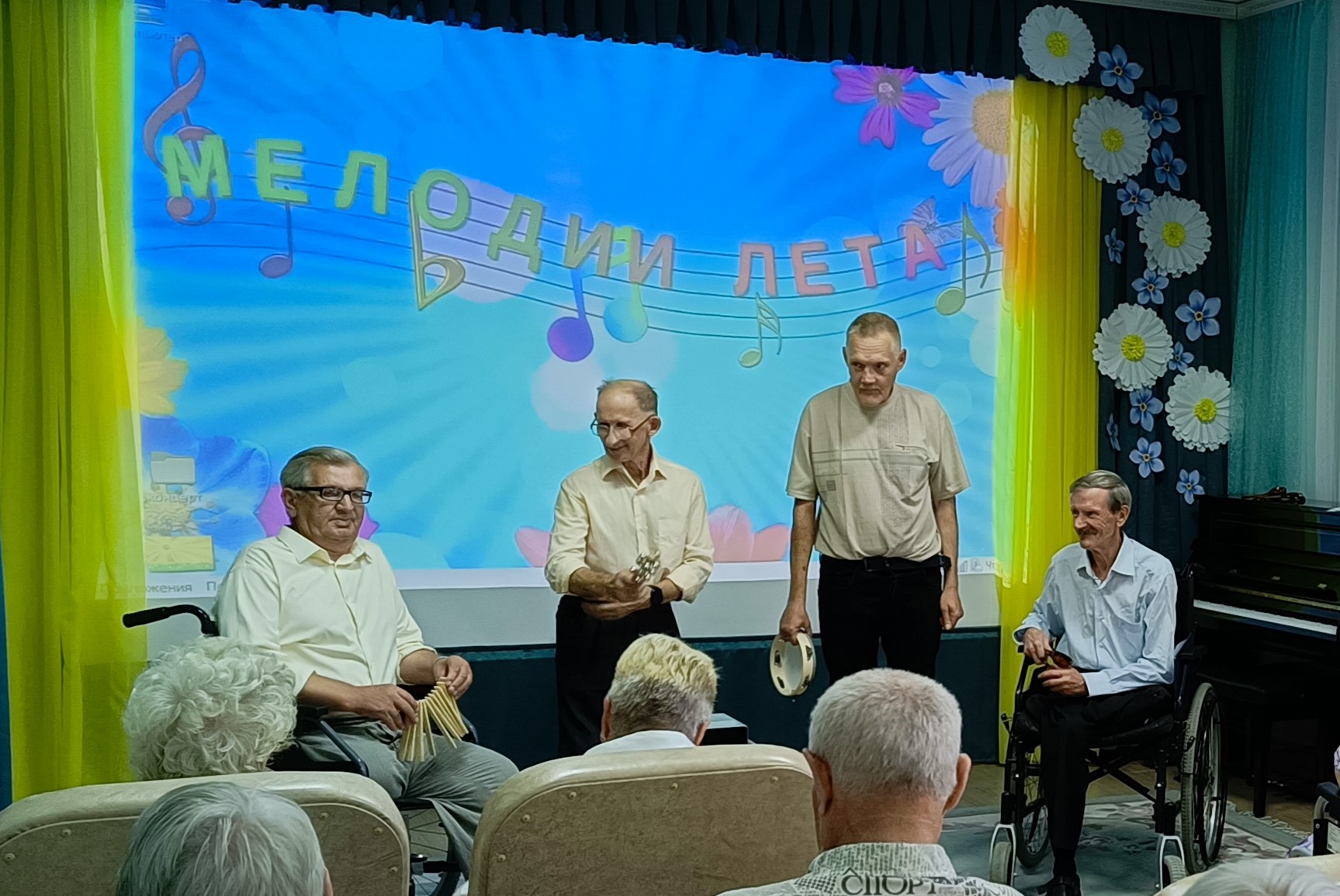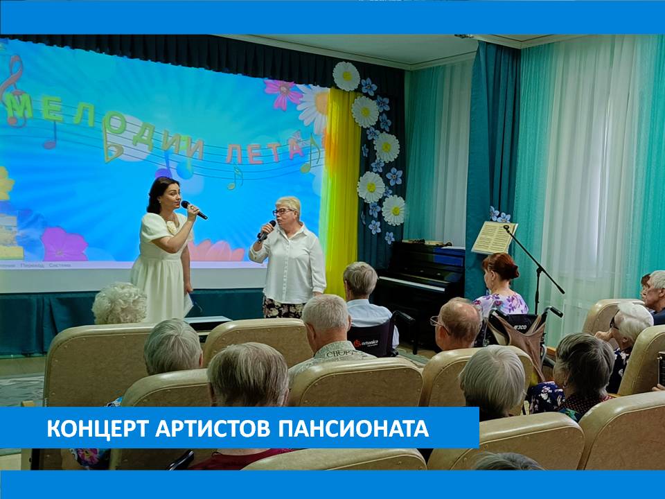 31 июля жителей Пансионата заряжали энергией и позитивом участники вокально-музыкальной студии «Гармония». Концертная программа была разнообразна и интересна. Звучали всеми любимые песни – «Белая лебёдушка», «Называют меня не красивою», «Первым делом – самолёты», «Вологда». Взбодрили и развеселили всех задорные частушки, а мужской квартет шумовых инструментов «Завалинка» порадовал всех музыкальными композициями «Ярмарка» и «Деревенская кадриль».