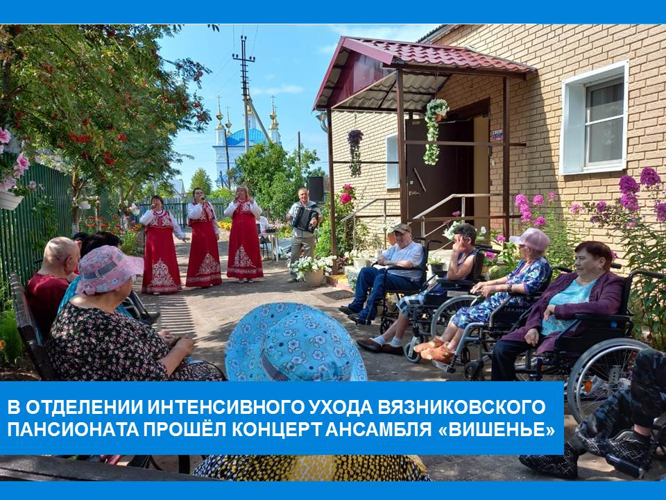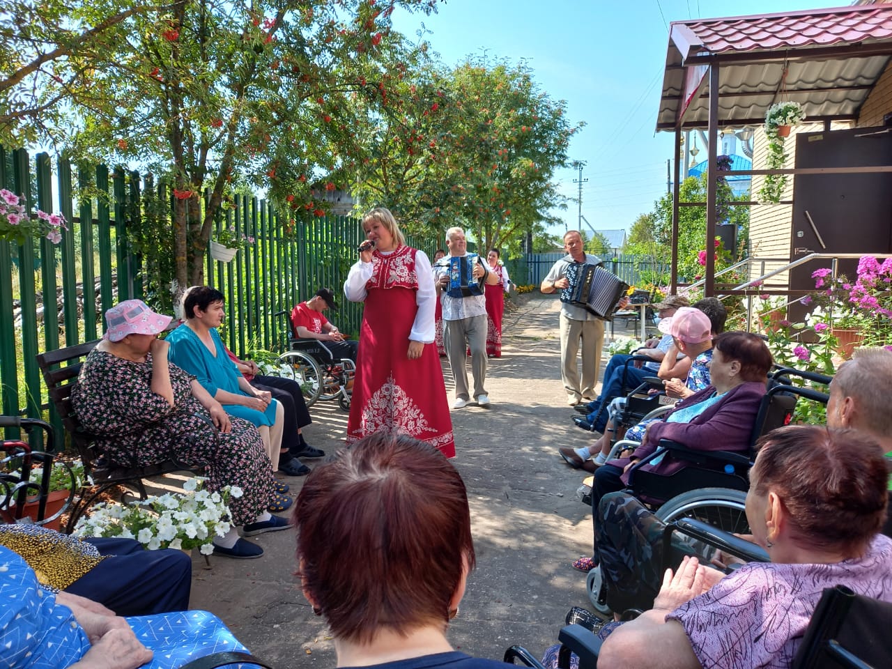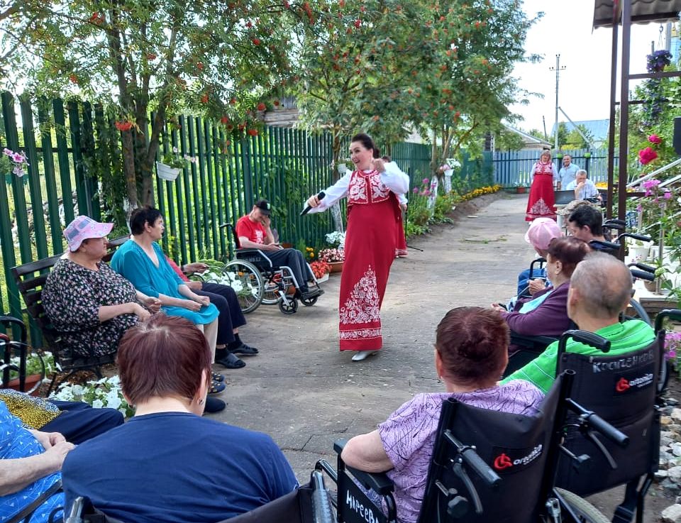 С концертной программой «Хорошее настроение» перед жителями отделения интенсивного ухода (с. Сарыево) выступил народный коллектив - ансамбль «Вишенье». Более часа артисты ансамбля радовали своим выступлением зрителей. В зале, под открытым небом, царила тёплая, дружественная атмосфера. Концертная  программа  была яркой и насыщенной, было в ней место и русской народной песне, и задорным современным. Благодарная публика, наслаждаясь задушевными песнями, принимала гостей громкими аплодисментами. Радостные лица пожилых людей и просьбы посещать их в будущем стали наивысшей наградой для участников этого мероприятия.