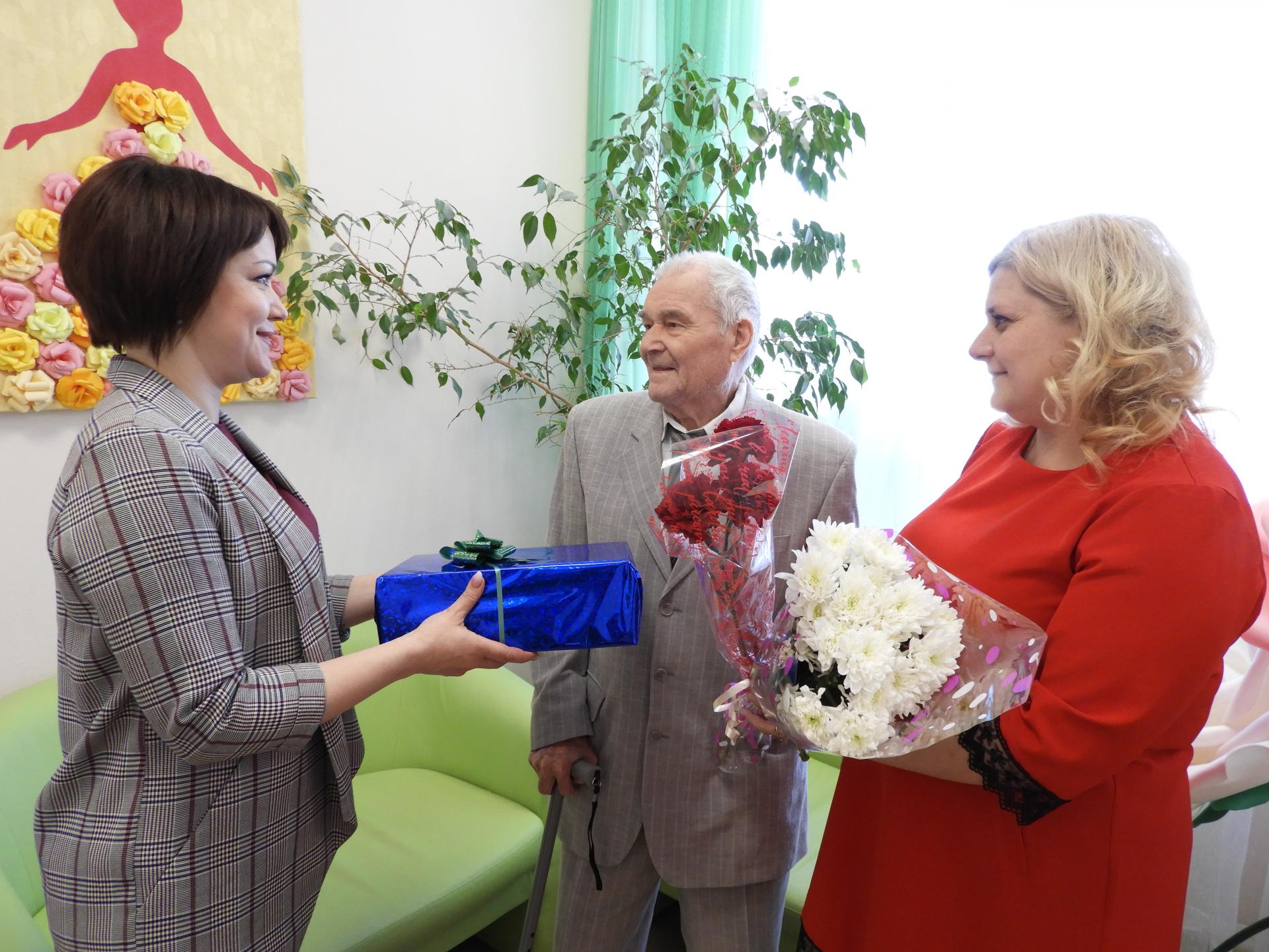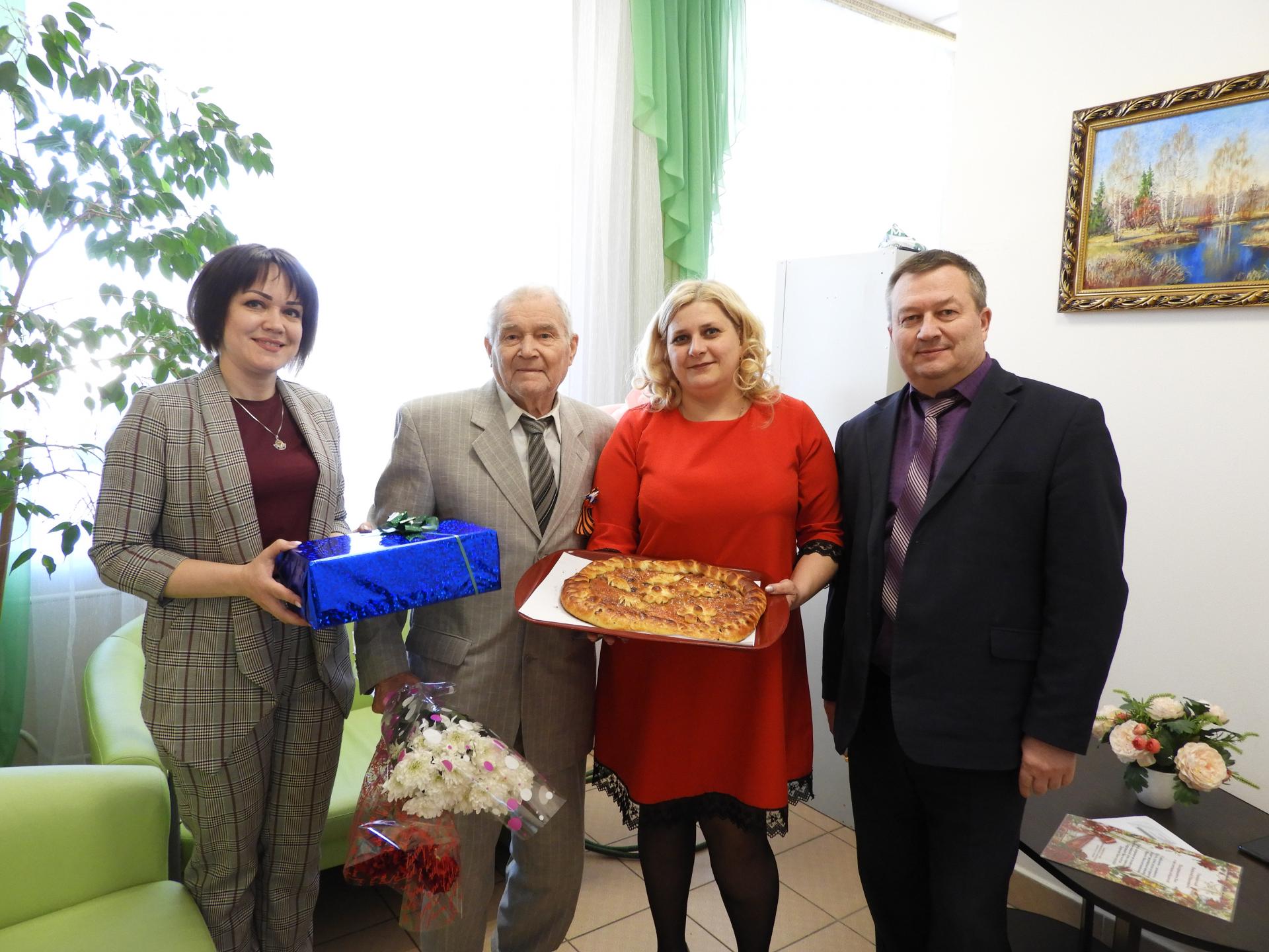 14 марта житель Вязниковского Пансионата Василий Иванович Липатов отметил свой 90-летний юбилей! С этой знаменательной датой Василия Ивановича поздравил заместитель Главы администрации района по вопросам жизнеобеспечения и строительства П.И. Мокров. Желая крепкого здоровья и долгих лет жизни, вручил ему памятные подарки и поздравительную телеграмму от президента Российской Федерации В.В. Путина. Так же, юбиляр принимал поздравления от жителей и сотрудников Пансионата. Цветы и подарки имениннику вручила директор Е.А. Сергеева, работники столовой испекли праздничный пирог, а музыкальным подарком (по внутреннему радио Пансионата) стала песня Олега Газманова «Ясные дни».