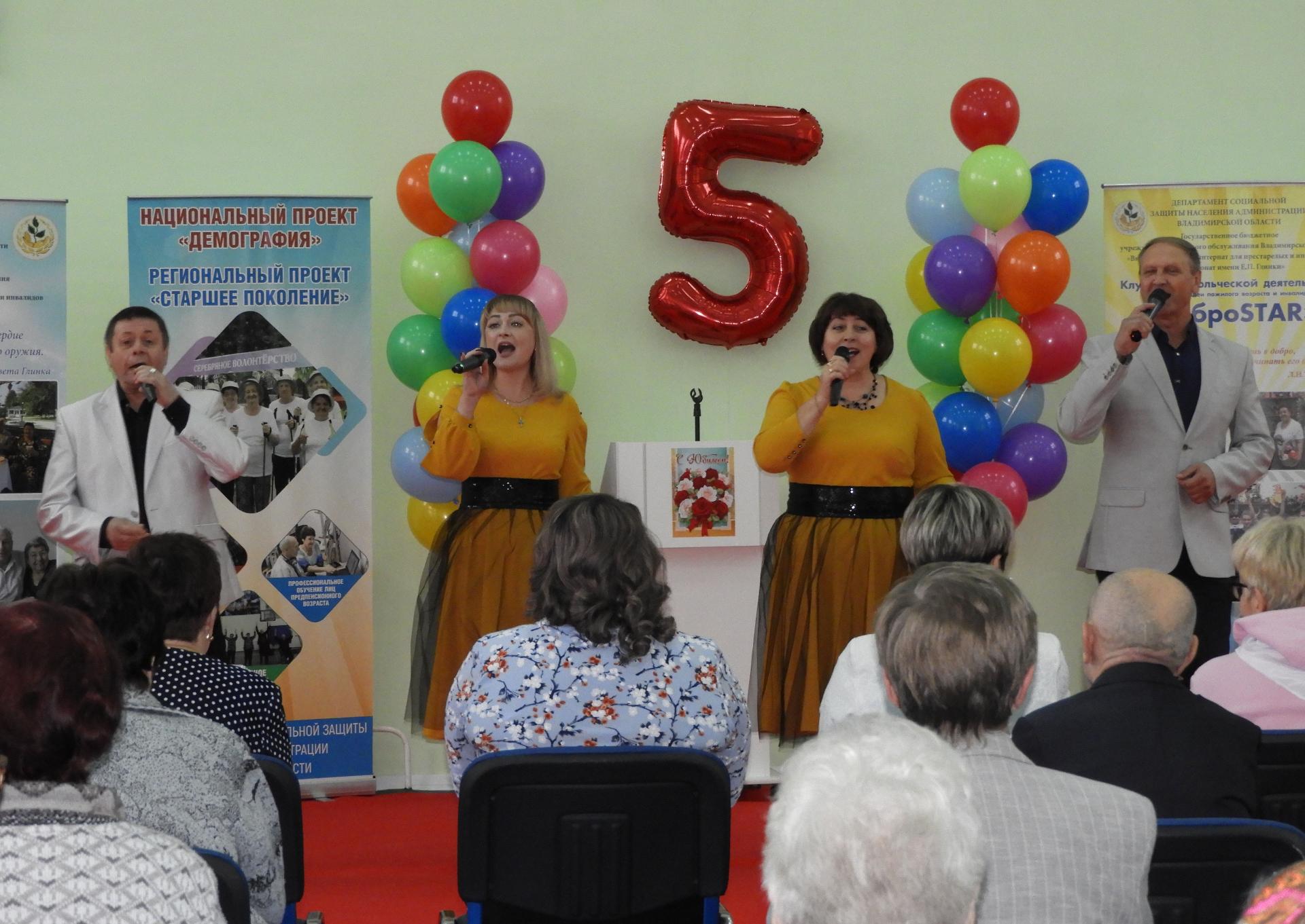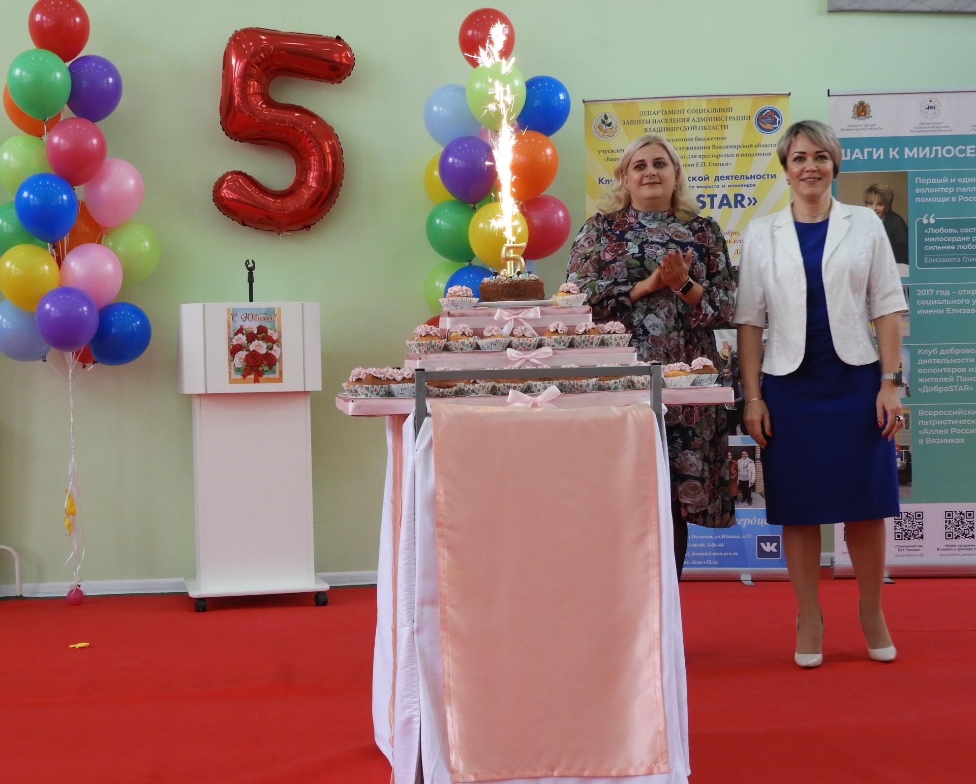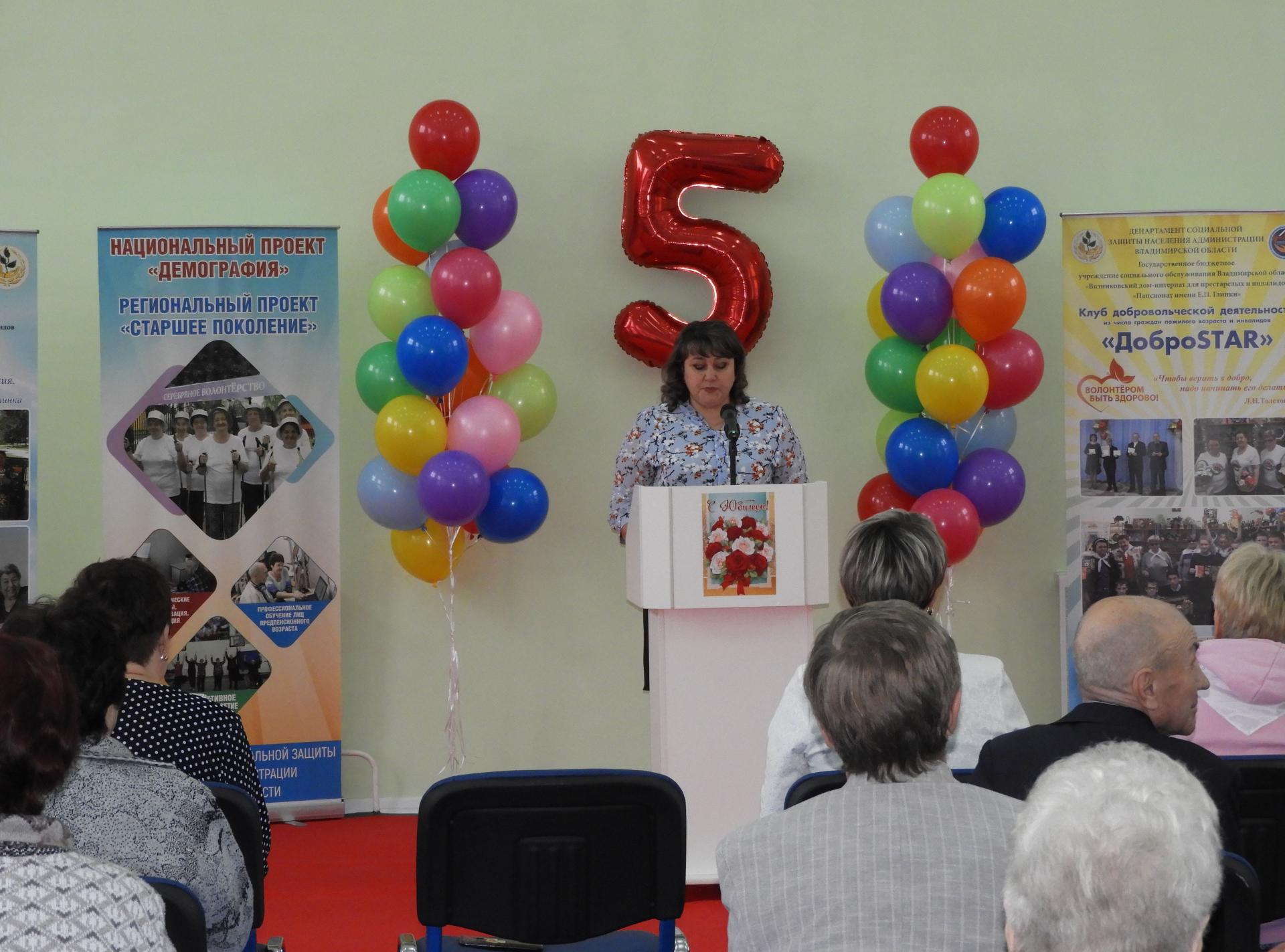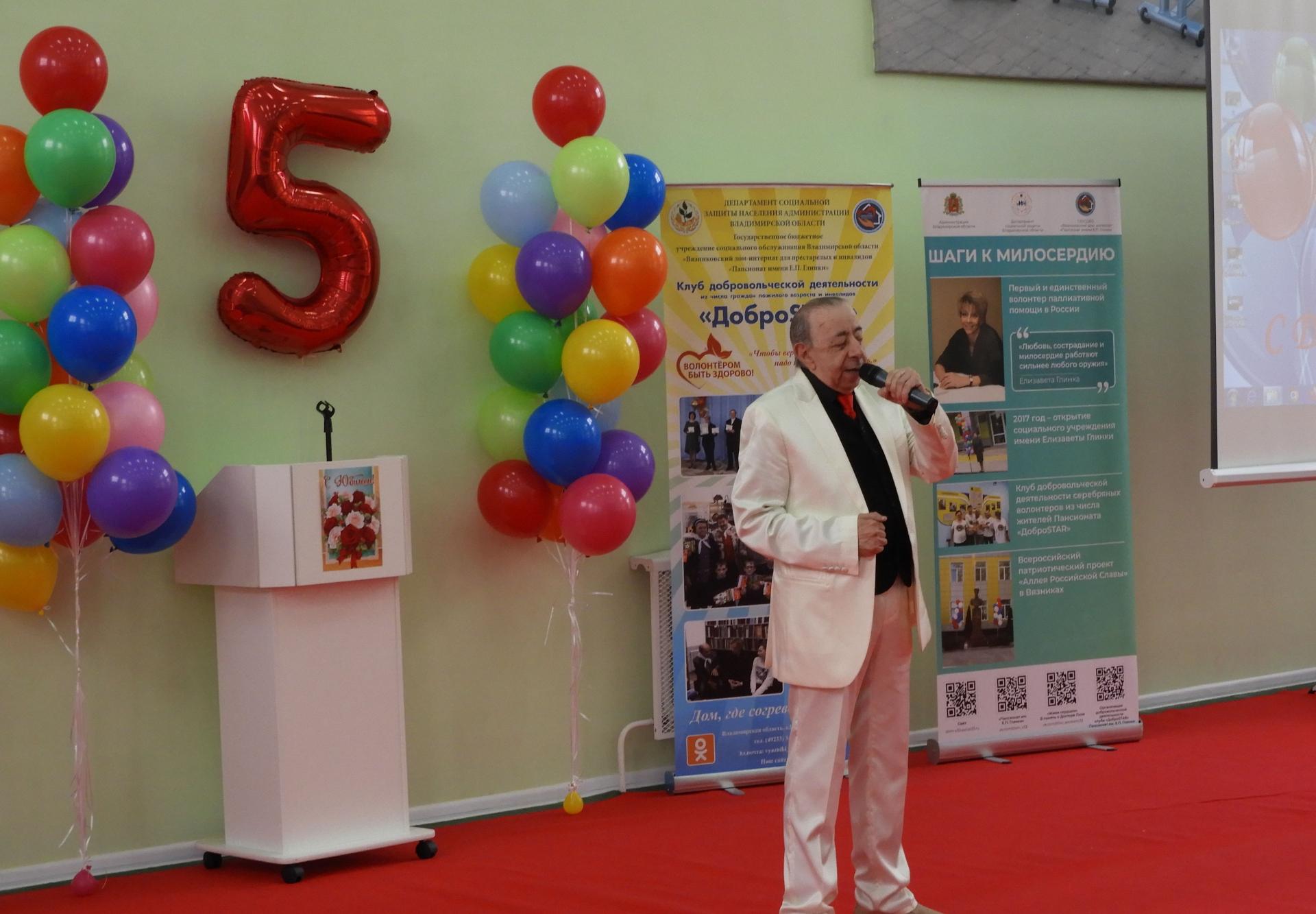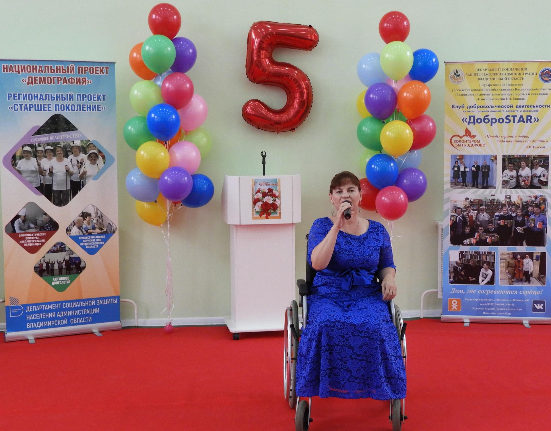 Торжественная часть началась с поздравлений. К сотрудникам и жителям Пансионата обратилась заместитель Главы, начальник управления аппарата администрации Вязниковского района Е.А. Максимова. Она пожелала всем крепкого здоровья, процветания и благополучия. Директор Пансионата Е.А. Сергеева, поздравляя всех с 5-летием,  выступила с небольшим итогом о проделанной работе. Так же большой коллектив Пансионата принимал поздравления в форме видеооткрыток от Вязниковской ДШИ им. Л.И. Ошанина, ИПБЦ «Интеллект», Международной благотворительной общественной организации «Справедливая помощь Доктора Лизы», Культурного центра им. А.И. Фатьянова и Вязниковского отделения Всероссийского общества инвалидов.