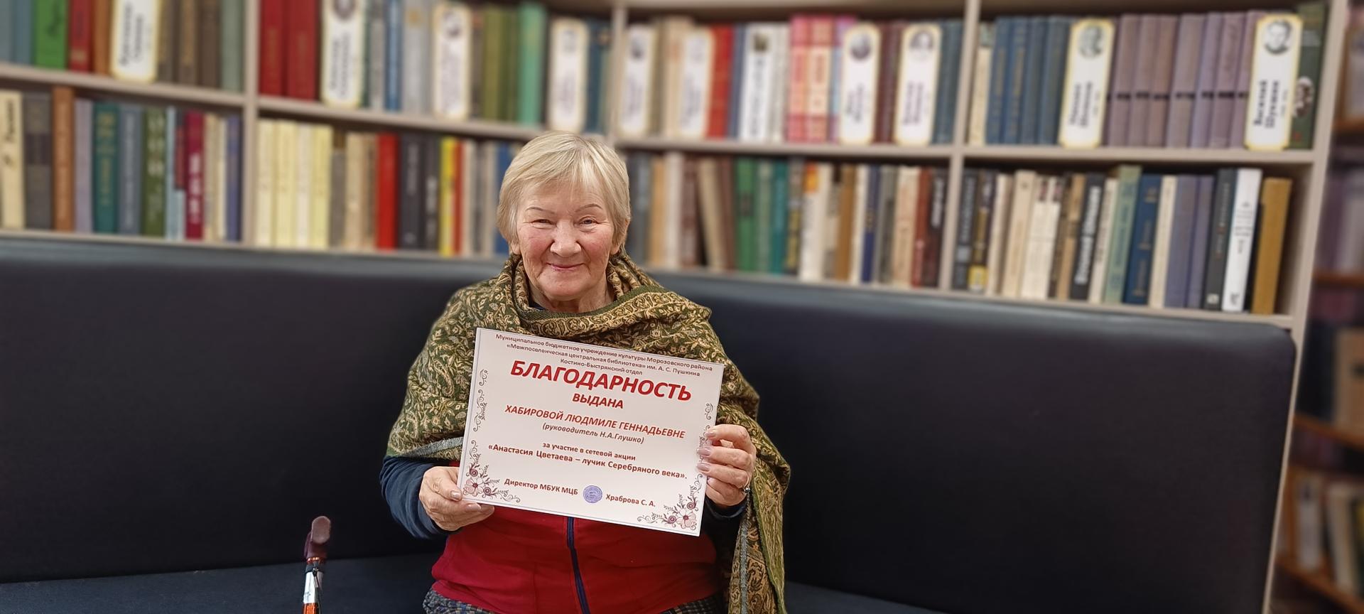 Жительница пансионата Людмила Хабирова принимала участие в сетевой акции «АНАСТАСИЯ ЦВЕТАЕВА – ЛУЧИК СЕРЕБРЯНОГО ВЕКА» и читала последнее стихотворение поэтессы. За участие в акции Людмила Хабирова отмечена благодарностью.