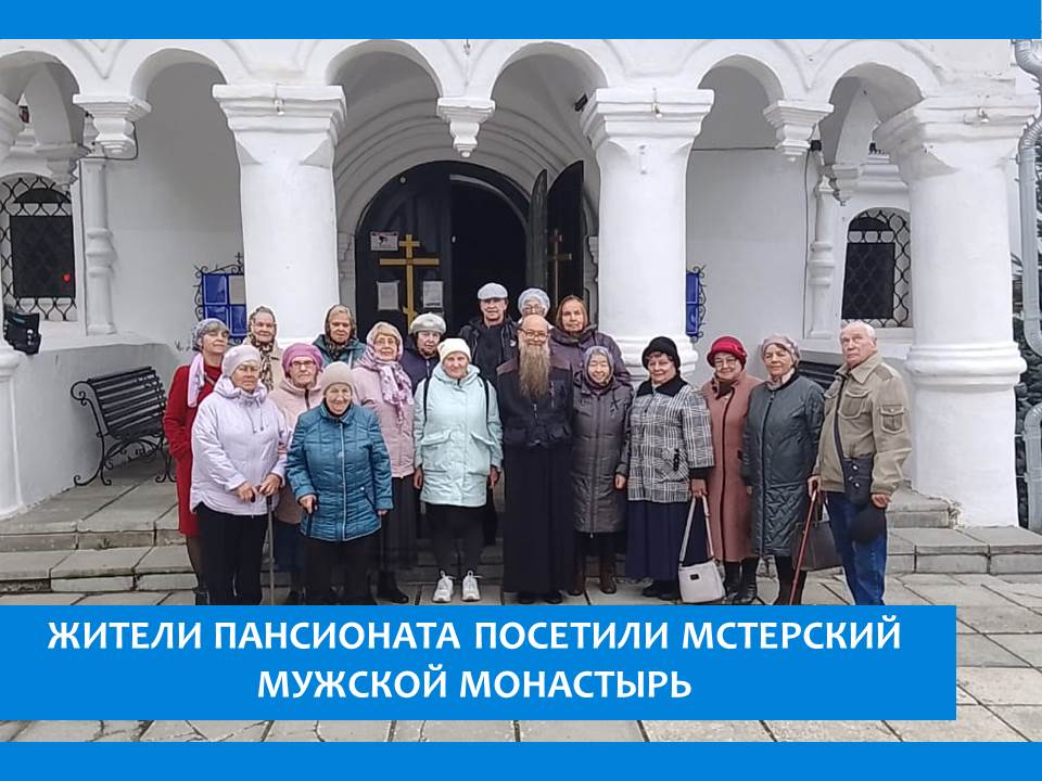 В рамках реализации социального туристического и культурно-исторического проекта «СТАРТуем!» жители пансионата по приглашению Вязниковского общества инвалидов прикоснулись к таинствам православной церкви – исповеди и причастию, посетив Мастерский мужской монастырь игумена Авраамия.. Посещение службы в церкви при Свято-Богоявленском мужском монастыре завершилось трапезой. Познавательная экскурсия по храму расширила знания о многовековой истории Мастерского монастыря, оставила тепло в душе, а так же желание побывать здесь вновь. Самое главное — это воспоминания, которые даёт посещение храма или монастыря — новые впечатления, остающиеся с туристом надолго.