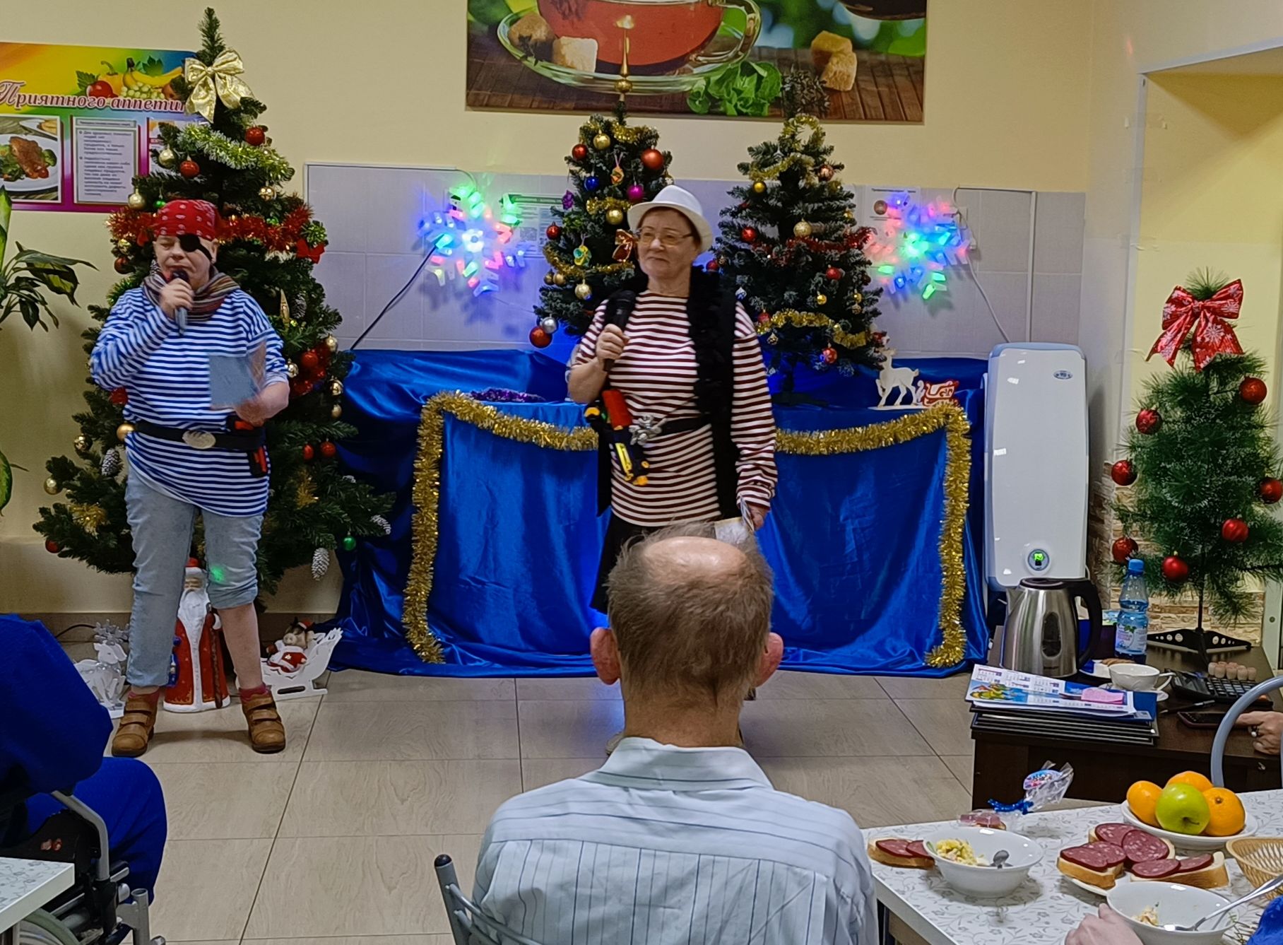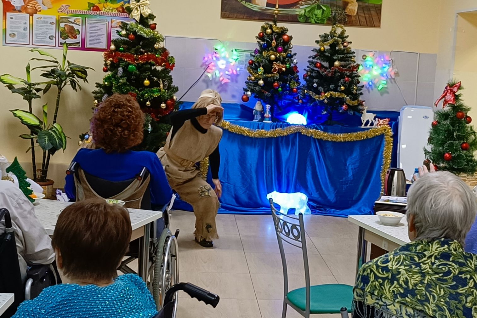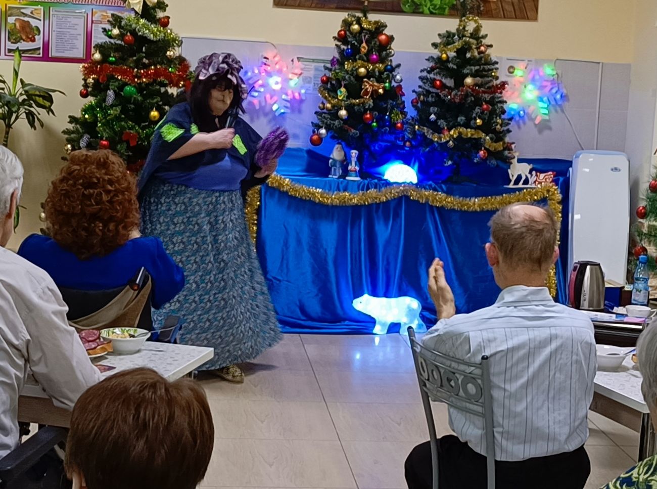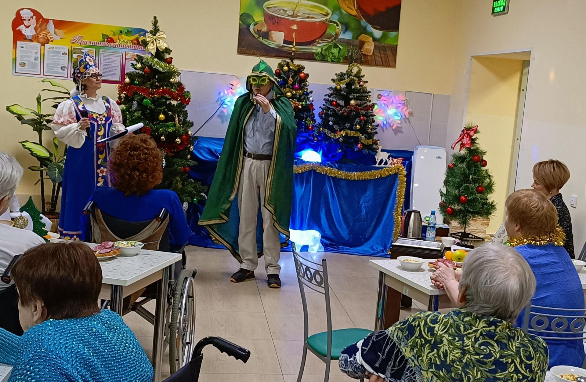 Сказочное действо началось с появлением Кота в сапогах, он пригласил всех волшебный мир сказки, а дальше – Трубодур с «песенкой друзей» и Василиса Премудрая – ведущая огонька. Вскоре ярко обозначил своё появление и символ года – Дракон. Он преподнёс подарки всем, кто родился в год Дракона. Желая всем добра и здоровья, «Дракон» уступил место другим героям. В гостях у новогодней сказки так же побывали Домовой, Баба-Яга, Его Величество – Король, Волшебник и Разбойницы. Все роли, кроме Кота в сапогах (студент колледжа – волонтёр), исполнялись жителями Пансионата. Театрализованные моменты были разбавлены викторинами, играми, конкурсами и, конечно же, песнями. Самую новогоднюю песню «В лесу родилась ёлочка» спел импровизированный хор «Дедушек-Морозушек». А самый долгожданный момент настал с появлением Деда Мороза и Снегурочки. Принимая от главных волшебников поздравления, всем преподнесли подарки.