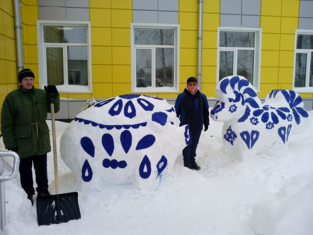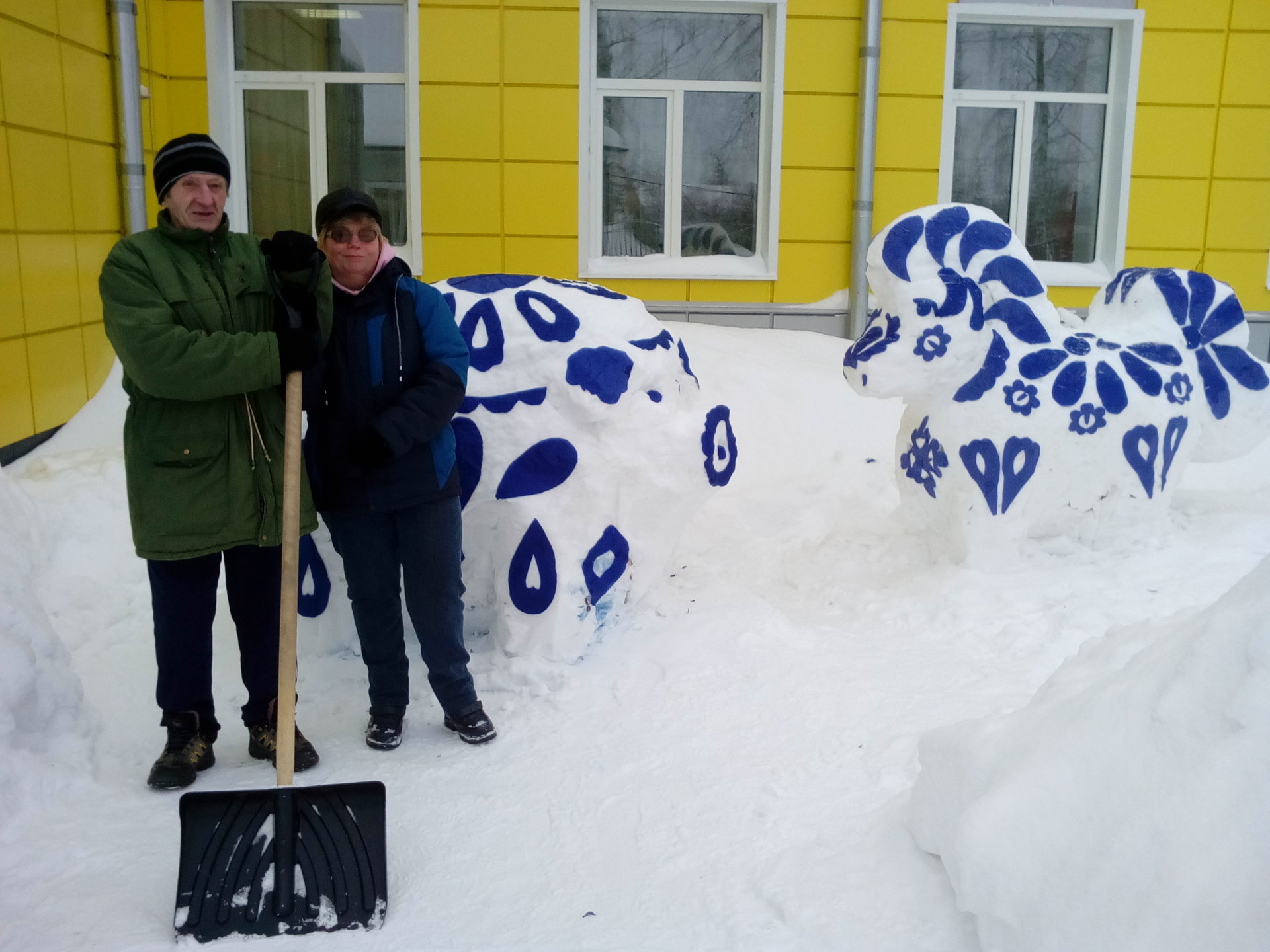 В этом году зима выдалась на удивление снежной. Снега столько намело, что кое-где сугробы образовались выше человеческого роста. Их-то мы и решили превратить в милых и забавных животных. Разукрасили в сказочном стиле «Гжель», и вот такая красота получилась у наших жителей Пансионата.