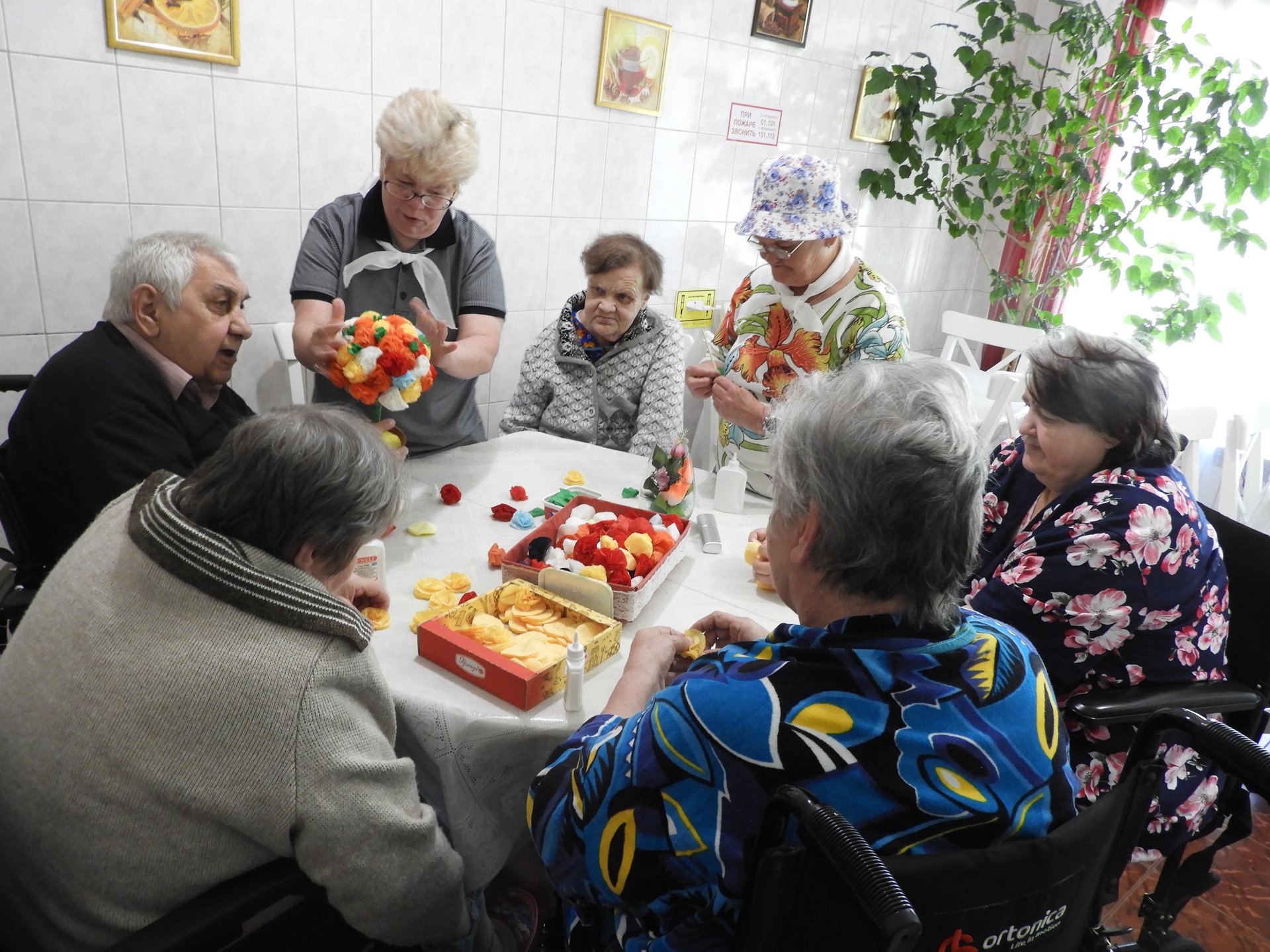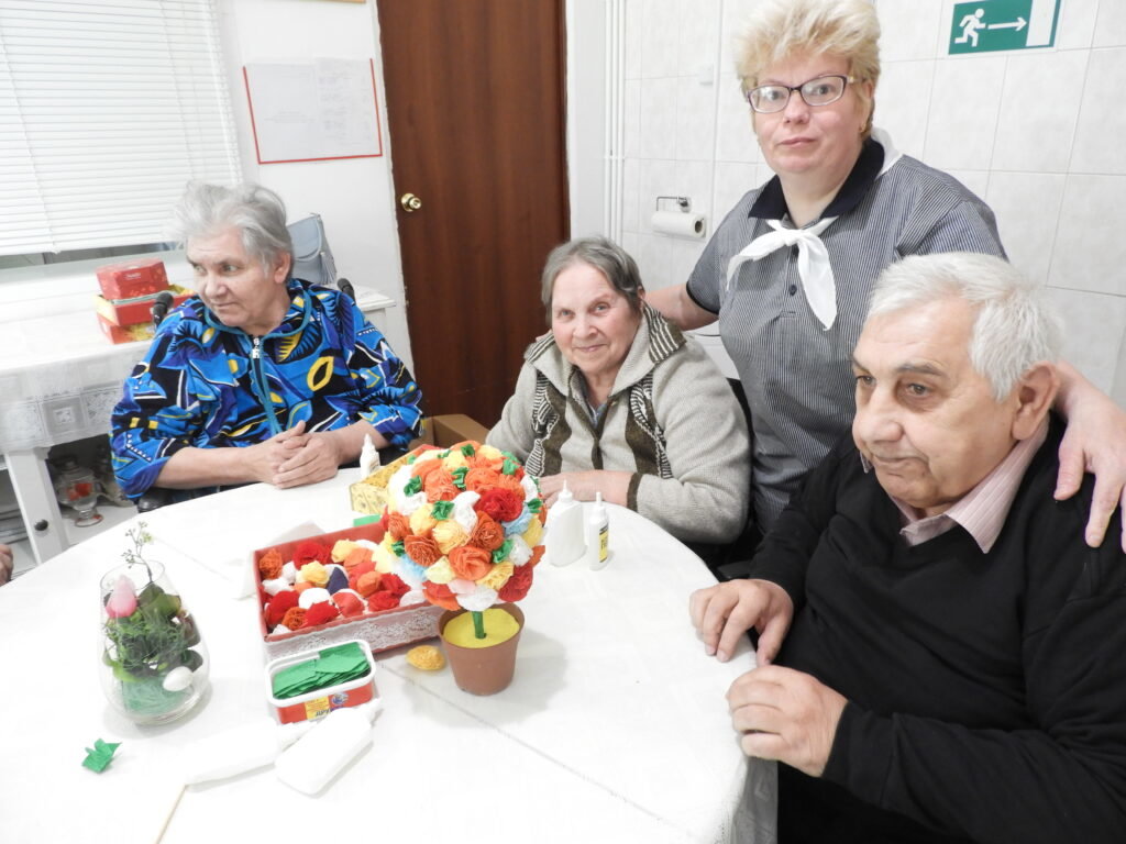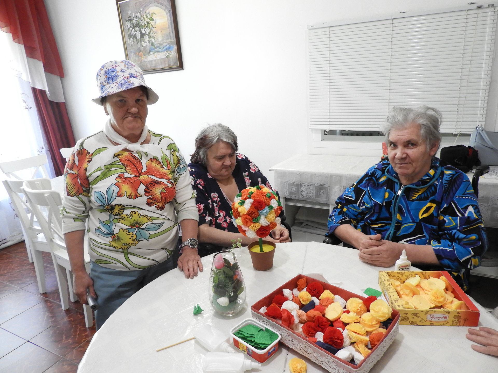 24 мая серебряные волонтеры нашего Пансионата приехали в гости к жителям отделения Милосердия с.Сарыево и провели мастер-класс по изготовлению яркого, солнечного топиария.  Из цветных салфеток делали цветы и крепили их на заготовку-основу. В теплой, дружественной обстановке время быстро пролетело, и вскоре «Солнечное дерево» было готово.