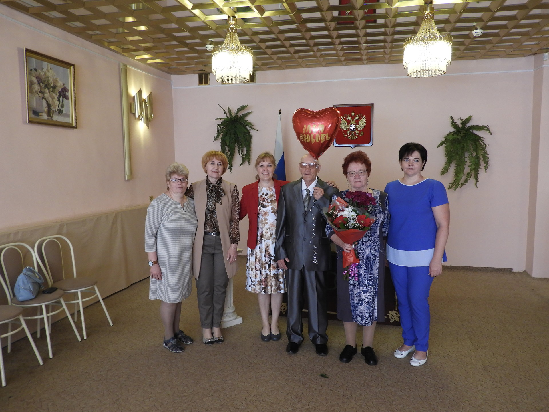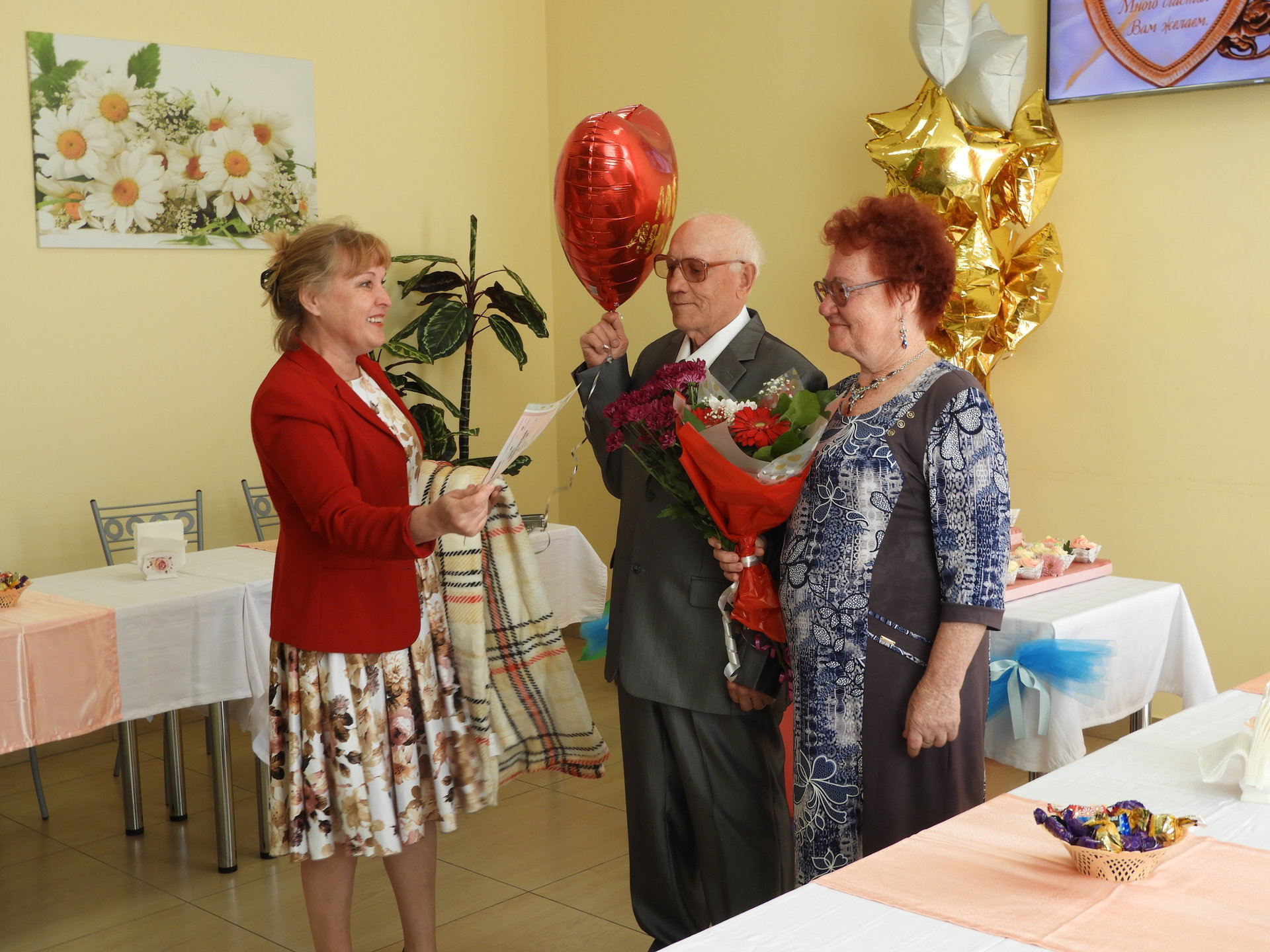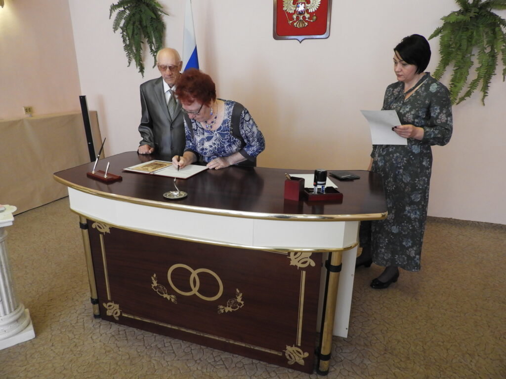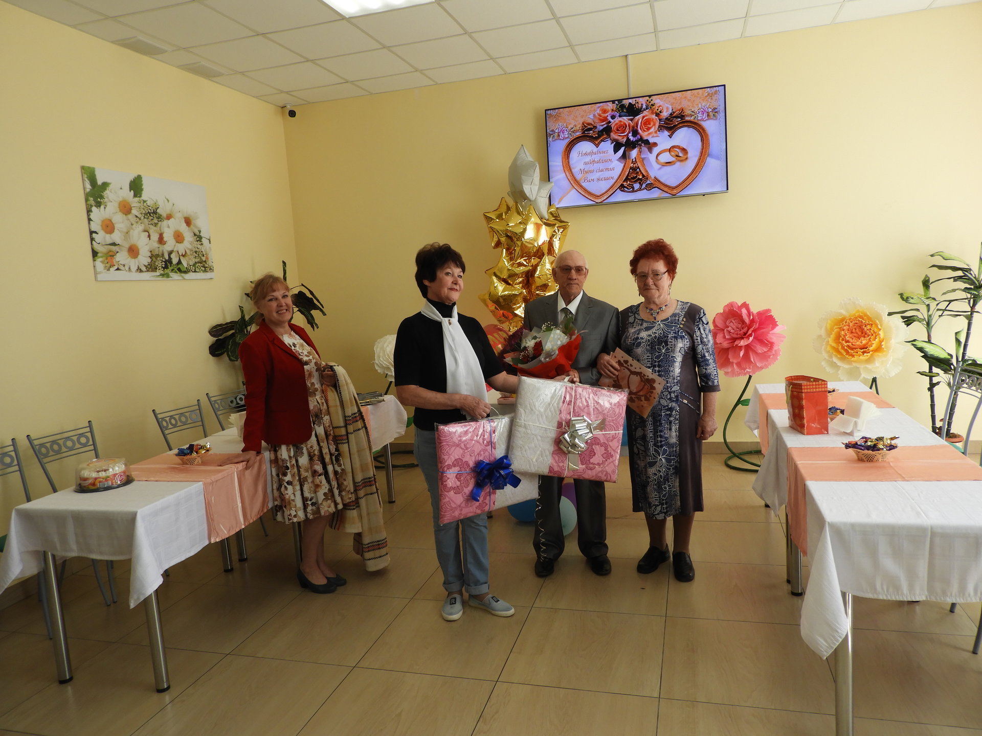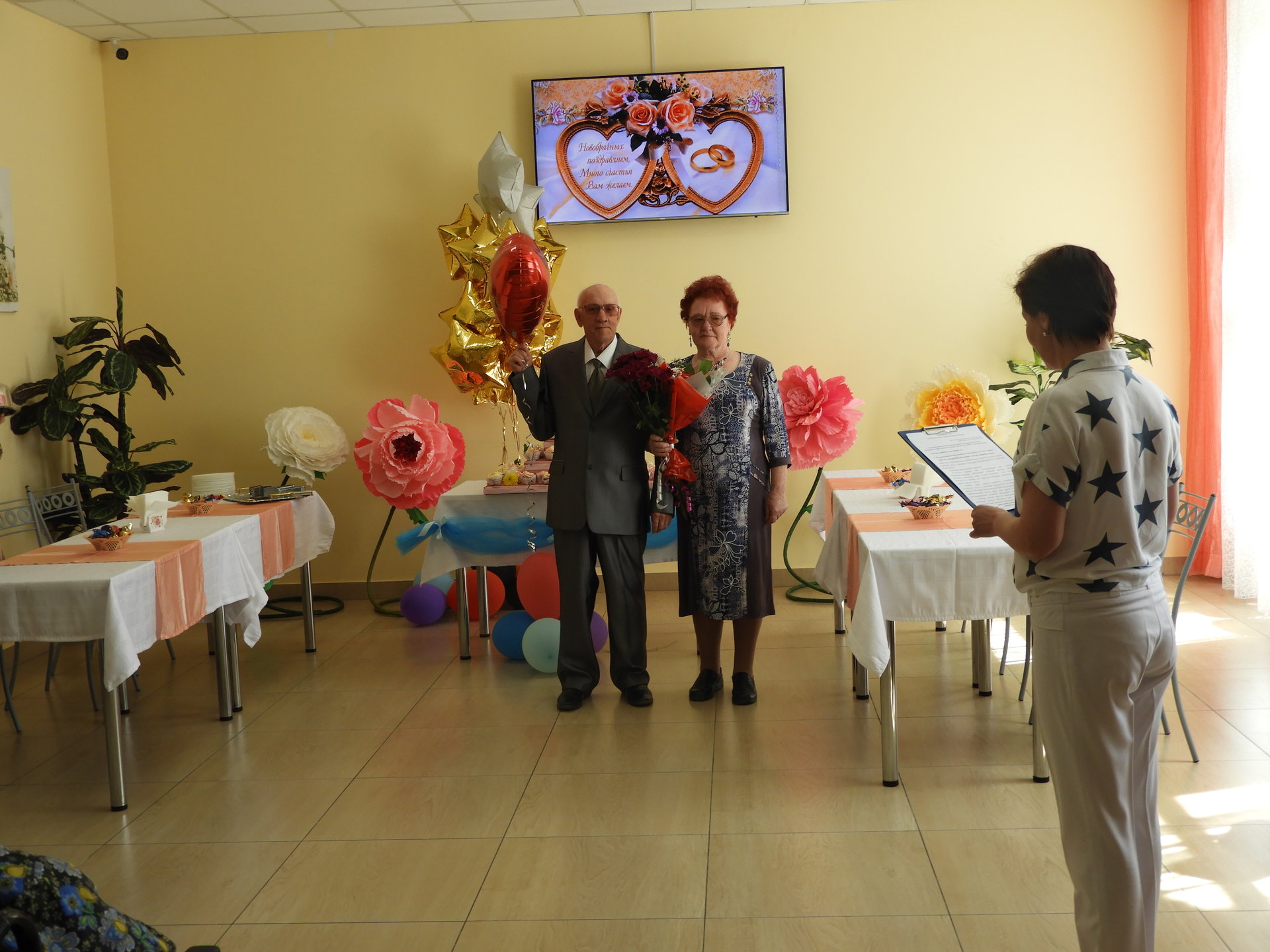 После церемонии бракосочетания виновников торжества встречали в Пансионате. Под громкие аплодисменты и музыку новобрачные и гости прошли в столовую, которая была празднично оформлена – воздушные шары, цветы и десертный стол. В адрес Любови Ивановны и Геннадия Михайловича звучали тёплые сердечные поздравления от администрации Пансионата, сотрудников, жителей и дочери Г.М. Огнева. Так же прозвучало поздравление от имени руководителя Культурного Центра им. А.И. Фатьянова, члена попечительского Совета Пансионата Анны Фатьяновой-Китиной. Новоиспечённой семье преподнесли подарки, супруге цветы, а от работников столовой свадебный торт.