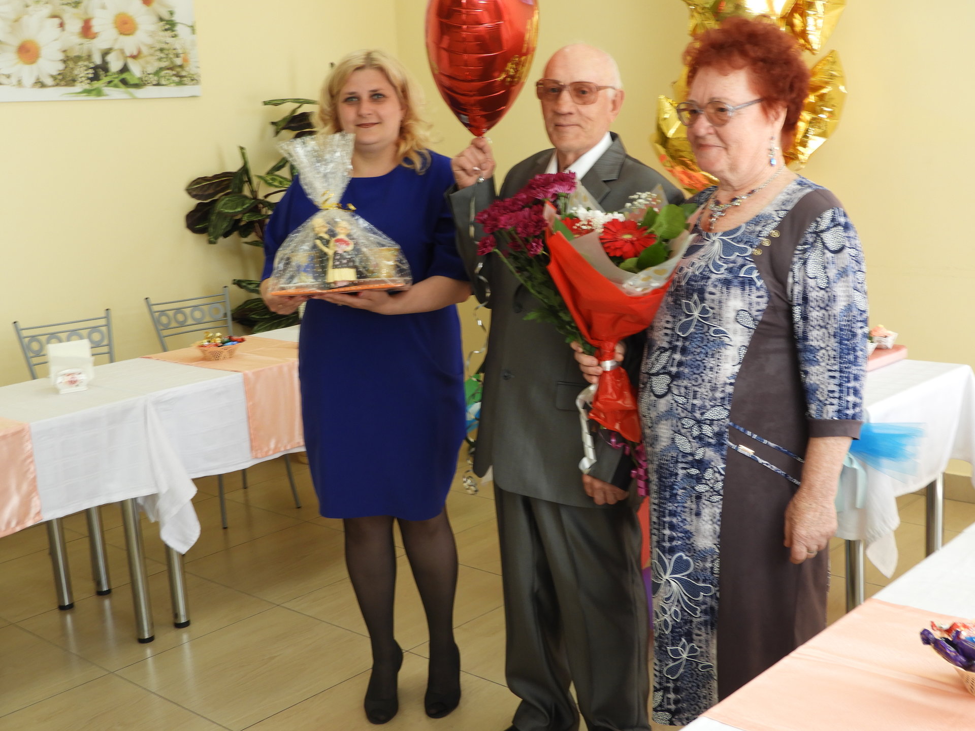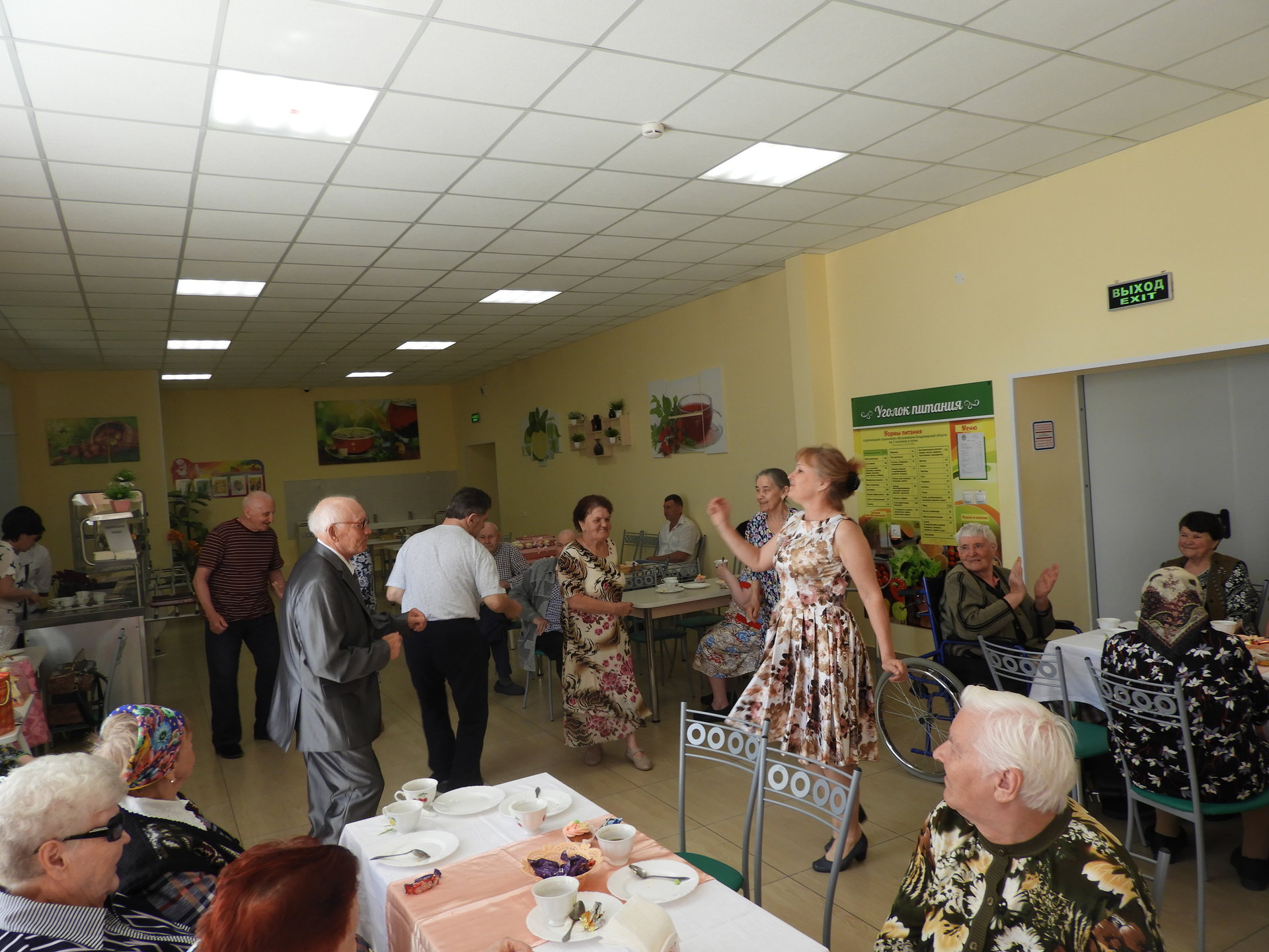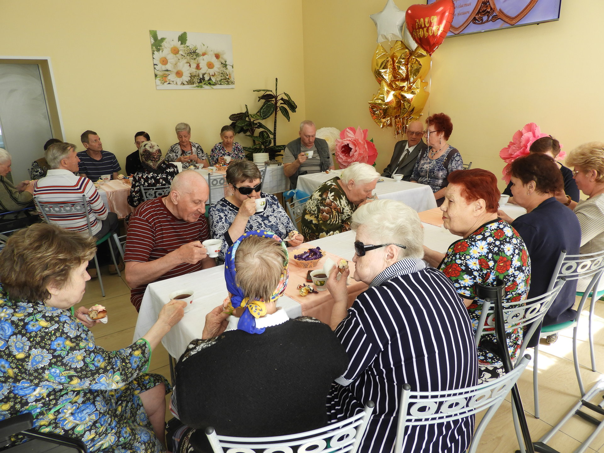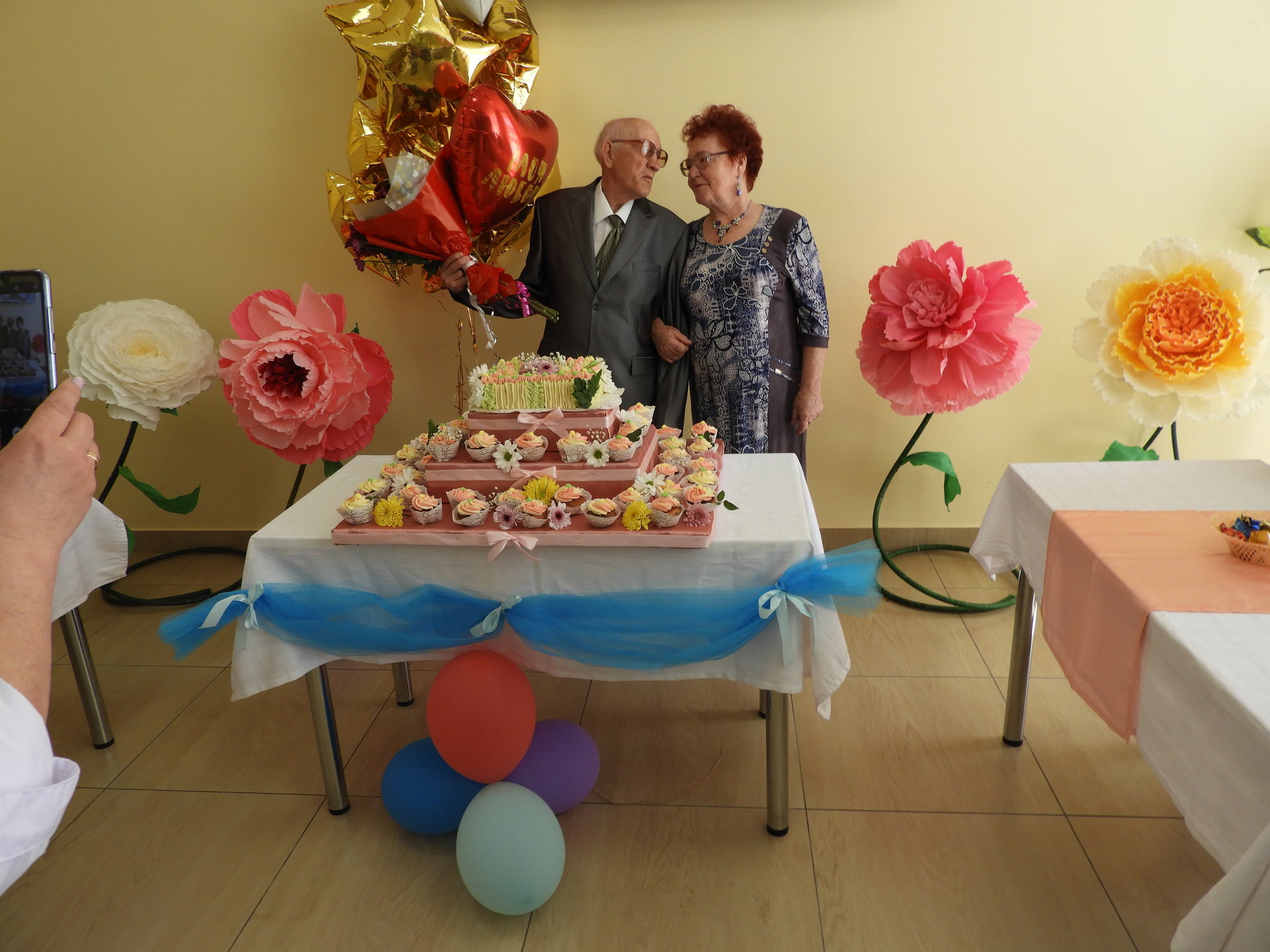 После церемонии бракосочетания виновников торжества встречали в Пансионате. Под громкие аплодисменты и музыку новобрачные и гости прошли в столовую, которая была празднично оформлена – воздушные шары, цветы и десертный стол. В адрес Любови Ивановны и Геннадия Михайловича звучали тёплые сердечные поздравления от администрации Пансионата, сотрудников, жителей и дочери Г.М. Огнева. Так же прозвучало поздравление от имени руководителя Культурного Центра им. А.И. Фатьянова, члена попечительского Совета Пансионата Анны Фатьяновой-Китиной. Новоиспечённой семье преподнесли подарки, супруге цветы, а от работников столовой свадебный торт.