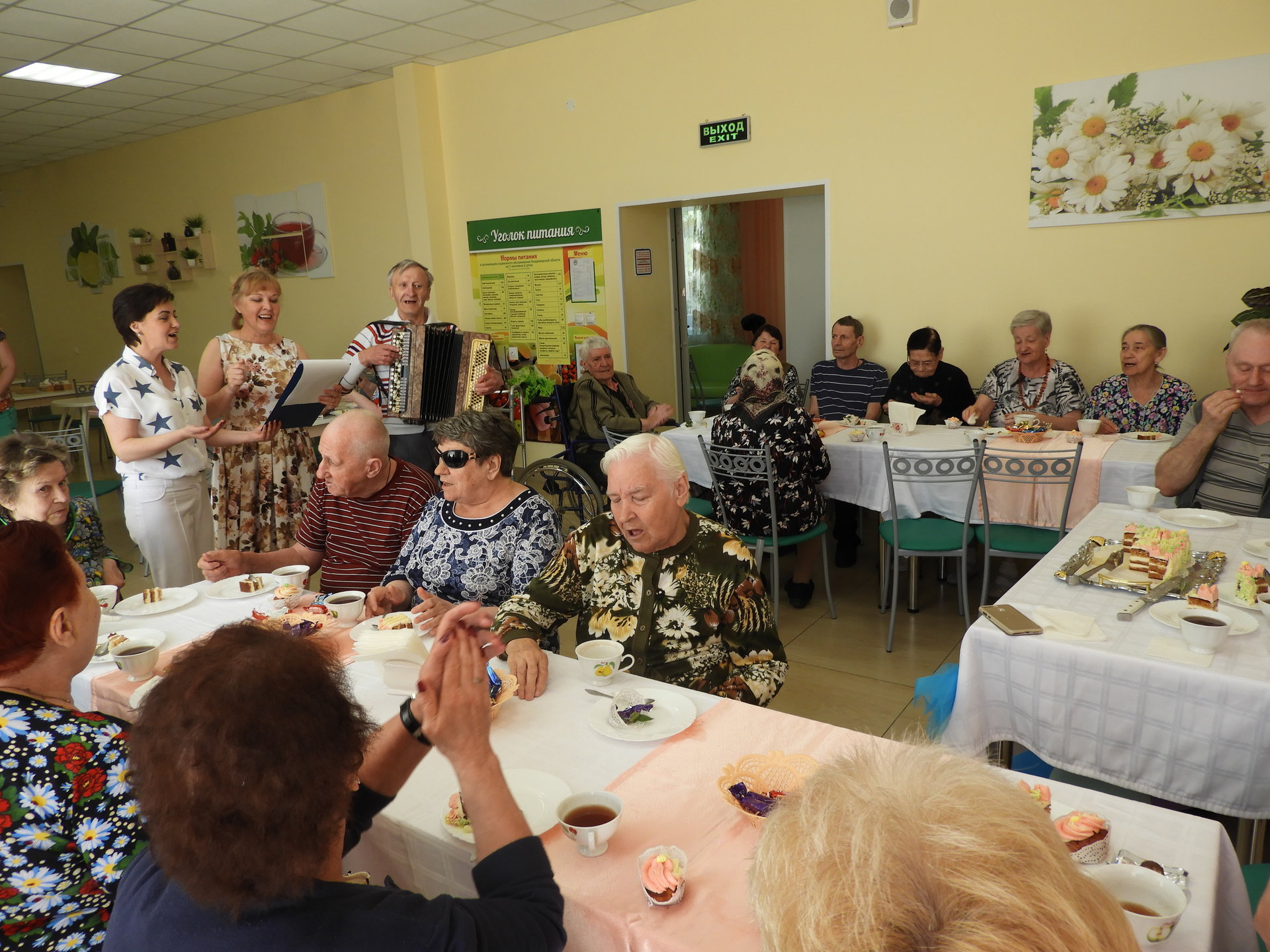 Во время праздничного чаепития звучала приятная музыка, а позже виновникам торжества был преподнесён музыкальный подарок. Все дружно пели любимые песни под баян, как полагается на любой свадьбе. Веселье продолжилось танцами. А фотографии, которые были сделаны в этот знаменательный день, супруги поместят в свой первый семейный фотоальбом.
