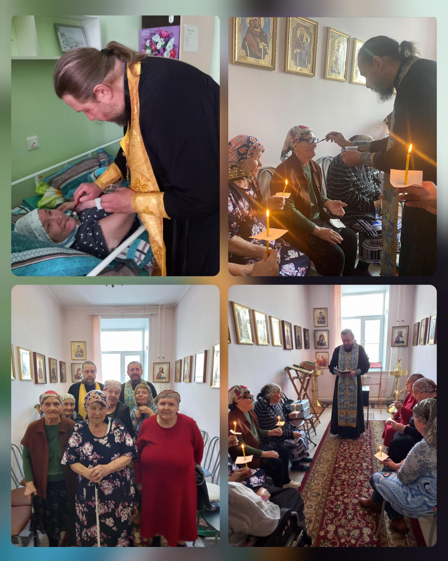 В Вязниковском пансионате  для престарелых людей и инвалидов настоятель Покровского храма протоиерей  Владимир и  иерей Владислав совершили Таинство Соборования и Причащения для всех желающих. Рассказали о смысле Великого поста, про приближающийся праздник Пасхи. После беседы они пришли  в отделение милосердия и помазали  святым елеем всех лежачих больных.