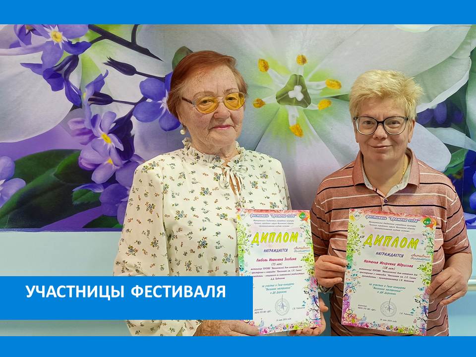 Жители Вязниковского Пансионата не пропускают ни одного сезона. И вот вновь – дипломы! Поздравляем Любовь Ивановну Злобину в декоративно-прикладном творчестве и Наталью Игоревну Идрисову в песенном творчестве. Молодцы!!! Так держать!
