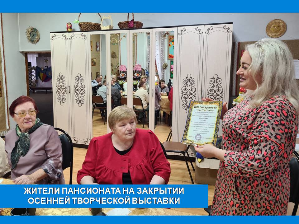 25 ноября в Доме народного творчества состоялось закрытие осенней выставки, на которую были приглашены все участники. Жителям Пансионата, чьи работы украшали выставку, вручили благодарственное письмо от муниципального бюджетного учреждения «Культурно-досуговый комплекс Вязниковского района».