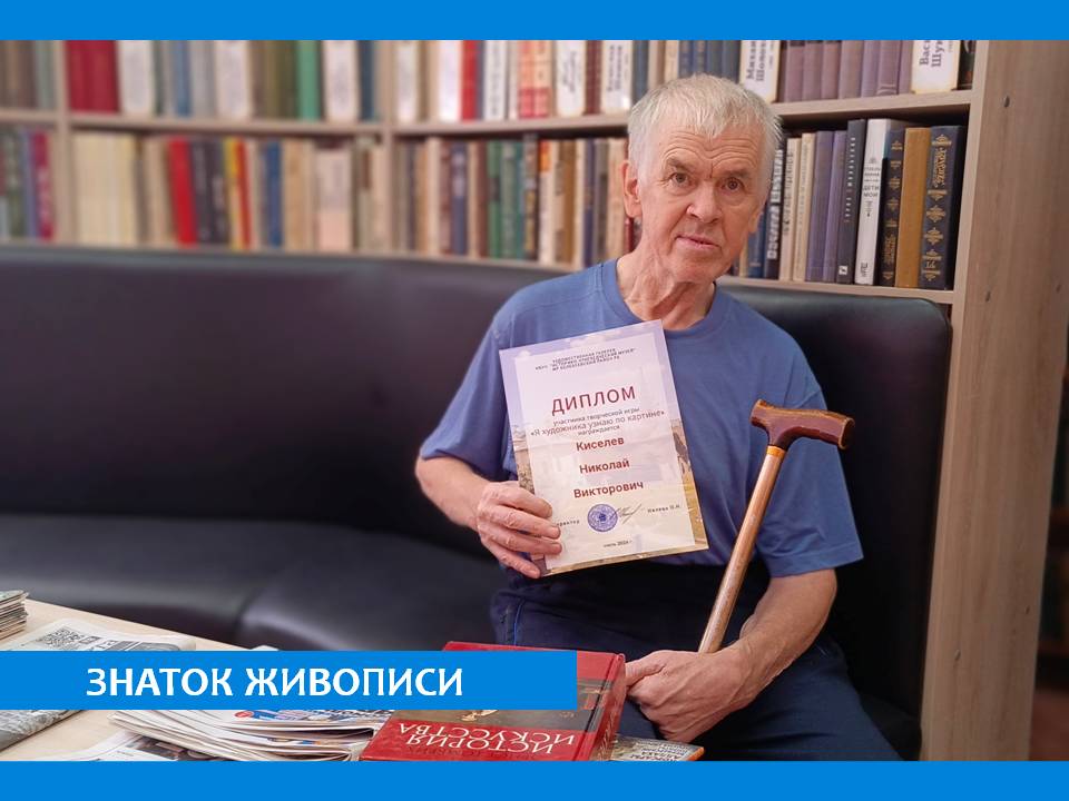 Житель пансионата Николай Викторович Киселев принял участие в онлайн – викторине «Шедевры русской живописи» и получил диплом знатока живописи. Ранее Николай Викторович входил в клуб художников при отделе культуры, преподавал в школе искусств и, разумеется, ему было не сложно прогуляться по Государственной Третьяковской галерее и отгадать авторов русских шедевров. Организатор #ХГБелебей #БелебеевскийИКМХ художественная галерея МБУК «Историко-краеведческий музей» муниципального района Белебеевский район Республики Башкортостан.
