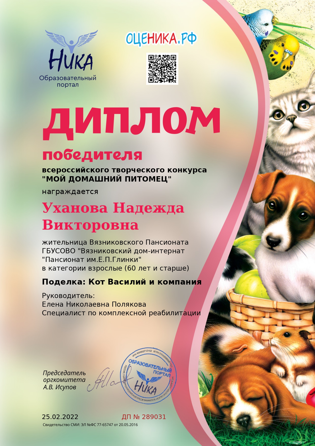 В очередной раз жительница Пансионата Надежда Викторовна Уханова стала призером в возрастной категории 60 лет и старше Всероссийского творческого онлайн-конкурса образовательного портала «Ника» под названием «Мой домашний питомец».