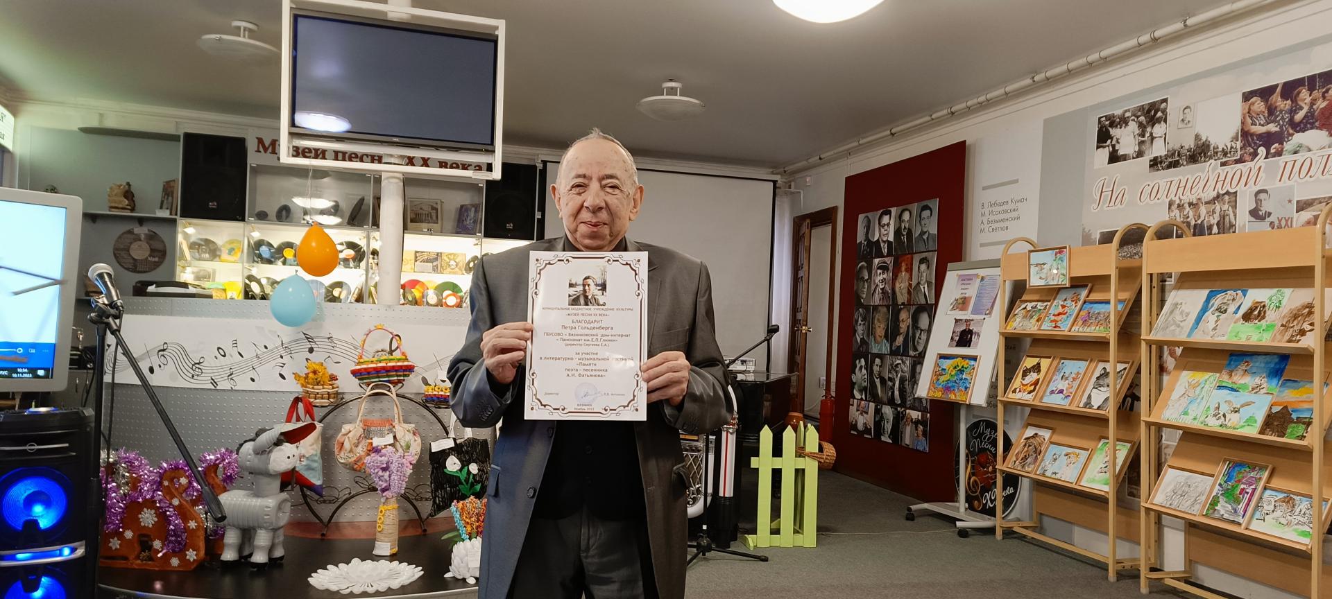День памяти поэта-песенника Алексея Ивановича Фатьянова жители пансионата отметили в музее песни XX века. Его стихи органично ложились на музыку, были простыми, легко запоминались с первого раза. На вечере звучали стихи и песни Фатьянова «Три года ты мне снилась», «Когда весна придёт», «Соловьи» и многие другие песни. Житель пансионата Петр Гольденберг исполнил две песни Алексея Фатьянова – «Тишина за Рогожской заставою» и «Пилоты», и был отмечен благодарностью Управления культуры и молодёжной политики администрации муниципального образования Вязниковский район Владимирской области. Музыкальное и поэтическое сопровождение придали вечеру творческую окраску, создали эмоциональный настрой и сделали вечер насыщенным.