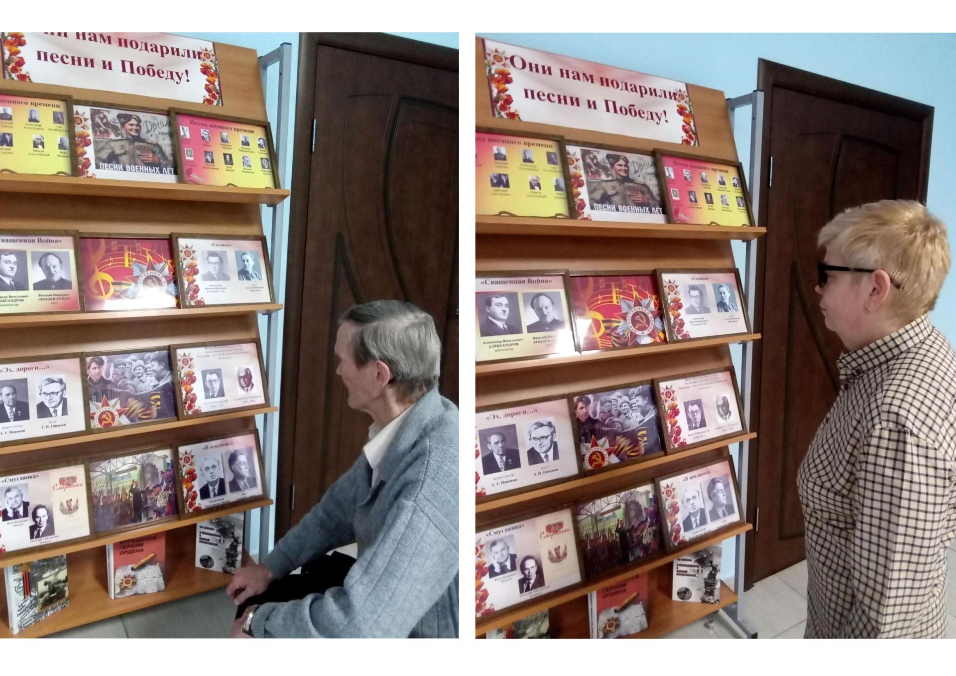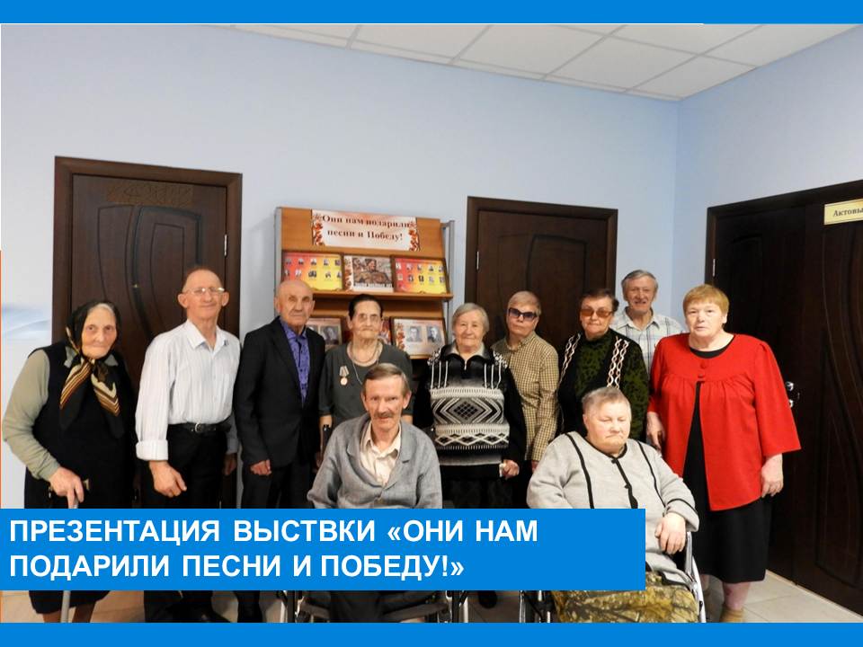 В преддверии Дня Победы жителям Вязниковского Пансионата была представлена выставка, посвящённая авторам песен Великой Отечественной войны. Это поэты и композиторы, которые своим творчеством так же приближали долгожданную Победу. Их песни вдохновляли на подвиг, поддерживали людей в трудные минуты и согревали сердца. Присутствующим были представлены имена авторов незабываемых песен и небольшая историческая справка. Во время презентации звучали легендарные «Катюша», «В землянке», «Эх, дороги», «Тёмная ночь» и др., которые всегда проникают глубоко в душу.