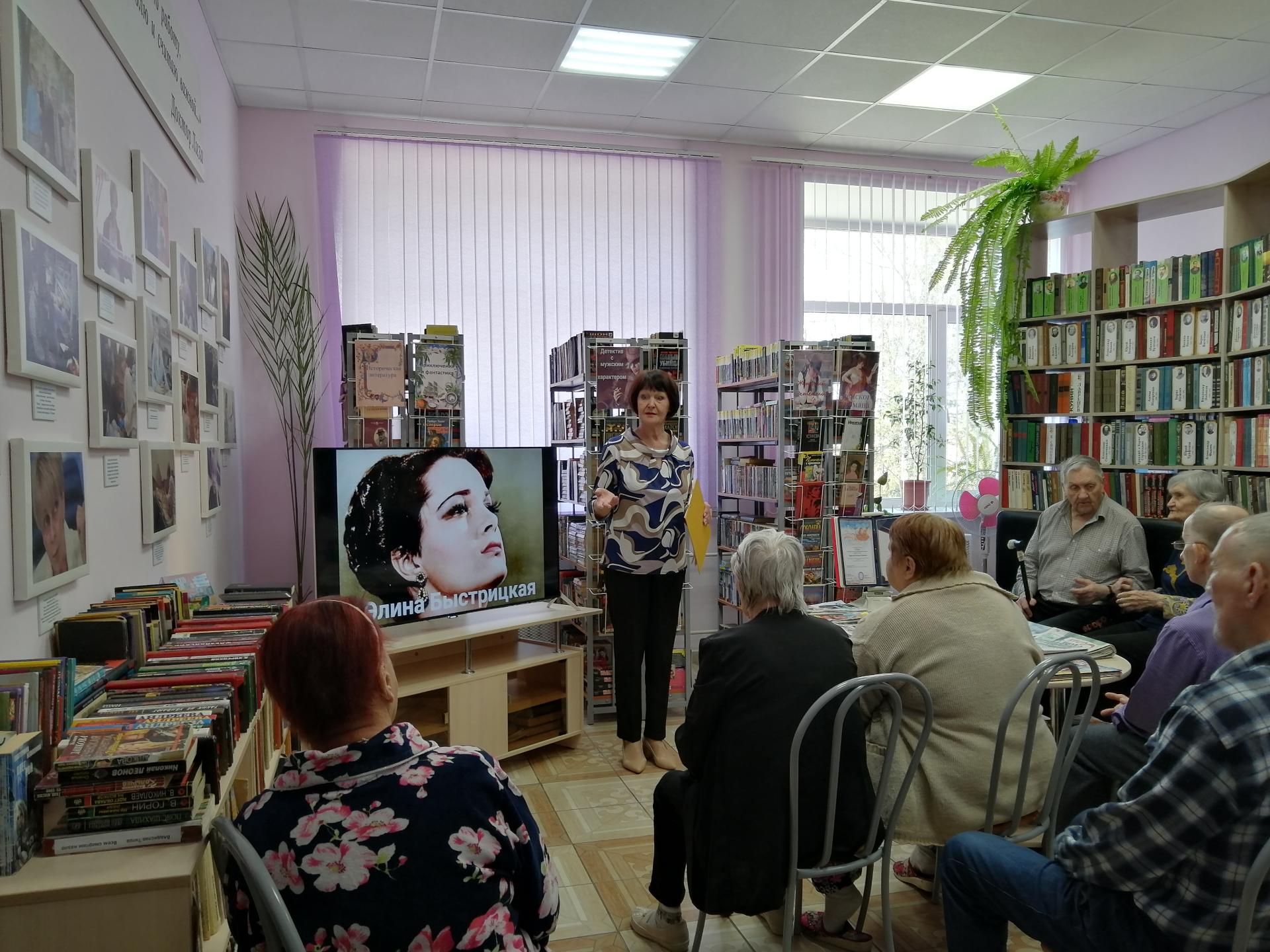 В библиотеке был проведен вечер – портрет «Судьба актрисы. Элина Быстрицкая», посвященный 95 – летию со дня рождения замечательной женщины, актрисы театра и кино. Прозвучал рассказ о детстве, юности, годах учебы, личной жизни, ролях, сыгранных в кино и на сцене театра. В ходе мероприятия демонстрировались видеоролики с отрывками фильмов с ее участием, среди которых «Неоконченная повесть», «Все остается людям», «Добровольцы», «Тихий Дон» и другие. Закончился вечер просмотром видеоролика «Лучшие роли Элины Быстрицкой на сцене театра и в кино».