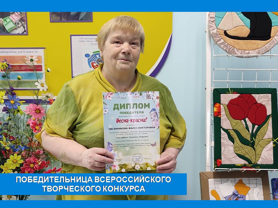 Дипломом победителя Всероссийского творческого онлайн-конкурса «Весна-красна» награждена жительница Вязниковского Пансионата Овсянникова Фаина Викторовна. На творческий конкурс, проводимый образовательным порталом «НИКА», была представлена работа «Тюльпаны» в технике «кинусайга». Данную технику Фаина Викторовна освоила совсем недавно, но уже какие результаты! Поздравляем!