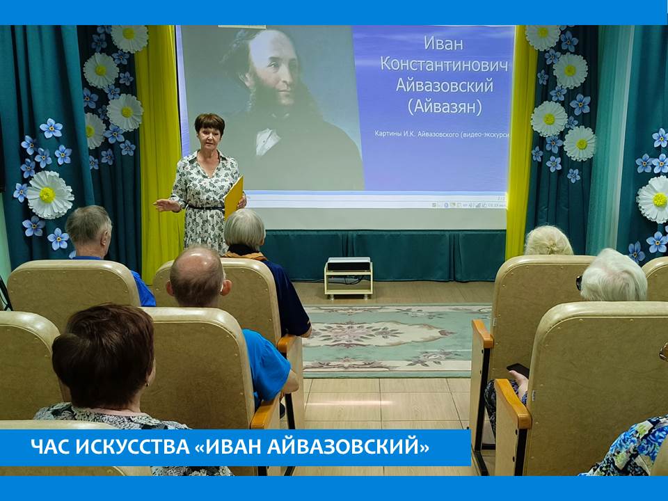 Час искусства, прошедший в пансионате, был посвящен художнику Ивану Константиновичу Айвазовскому. Участники мероприятия познакомились с его жизнью и творческим наследием. Иван Константинович всемирно известный русский художник-маринист, баталист, коллекционер, меценат. На мероприятии побеседовали о его полотнах, познакомились с биографией этого необычного человека влюбленного в море. Он вошел в историю мирового искусства как маринист-романтик, мастер русского классического пейзажа, передающий на полотне красоту и мощь морской стихии. Его кистью создано более 6000 полотен. В рамках клуба документального кино посмотрели фильм Бориса Маевского «Иван Айвазовский» снятый киностудией Крымнаучфильм.