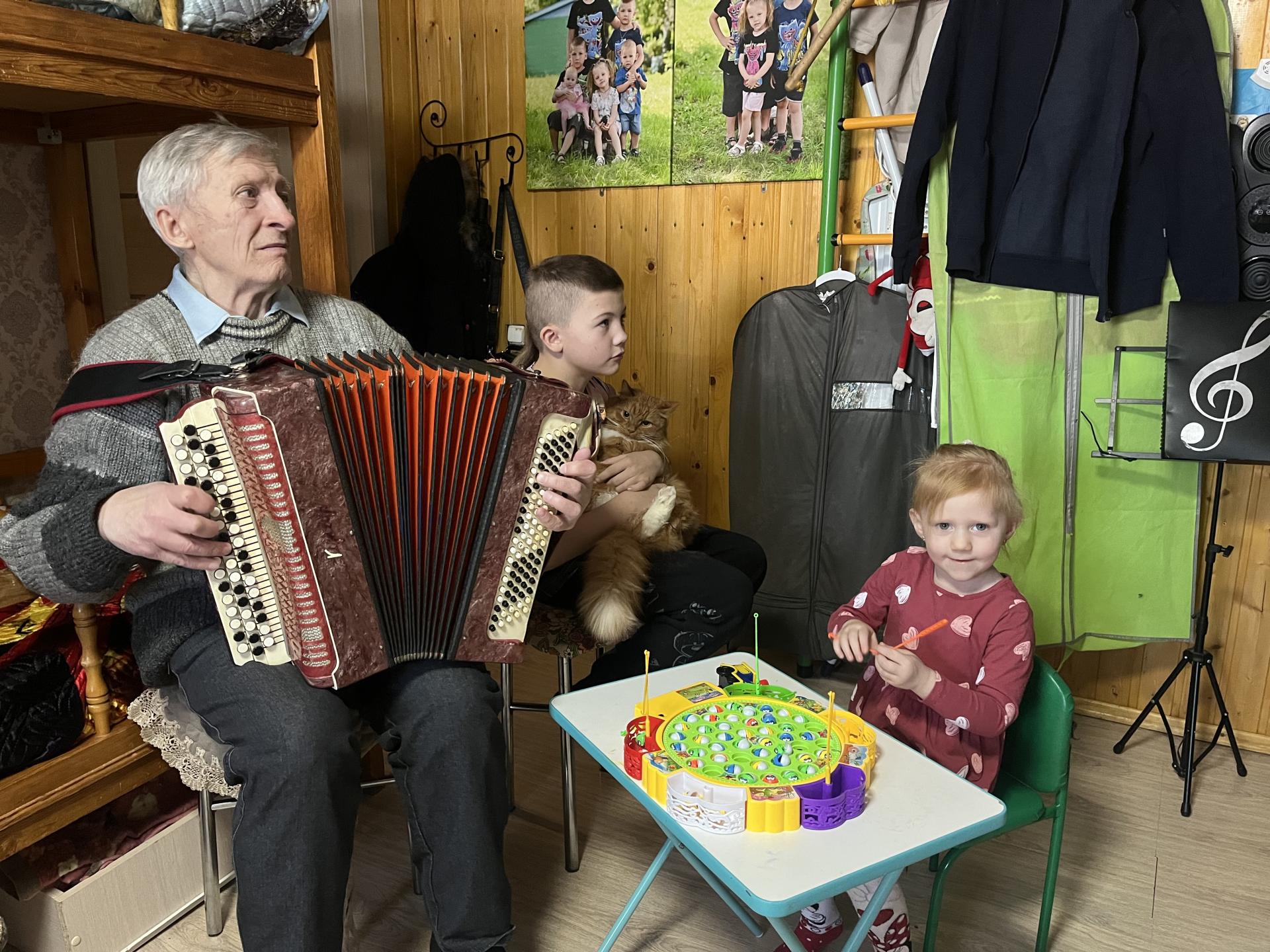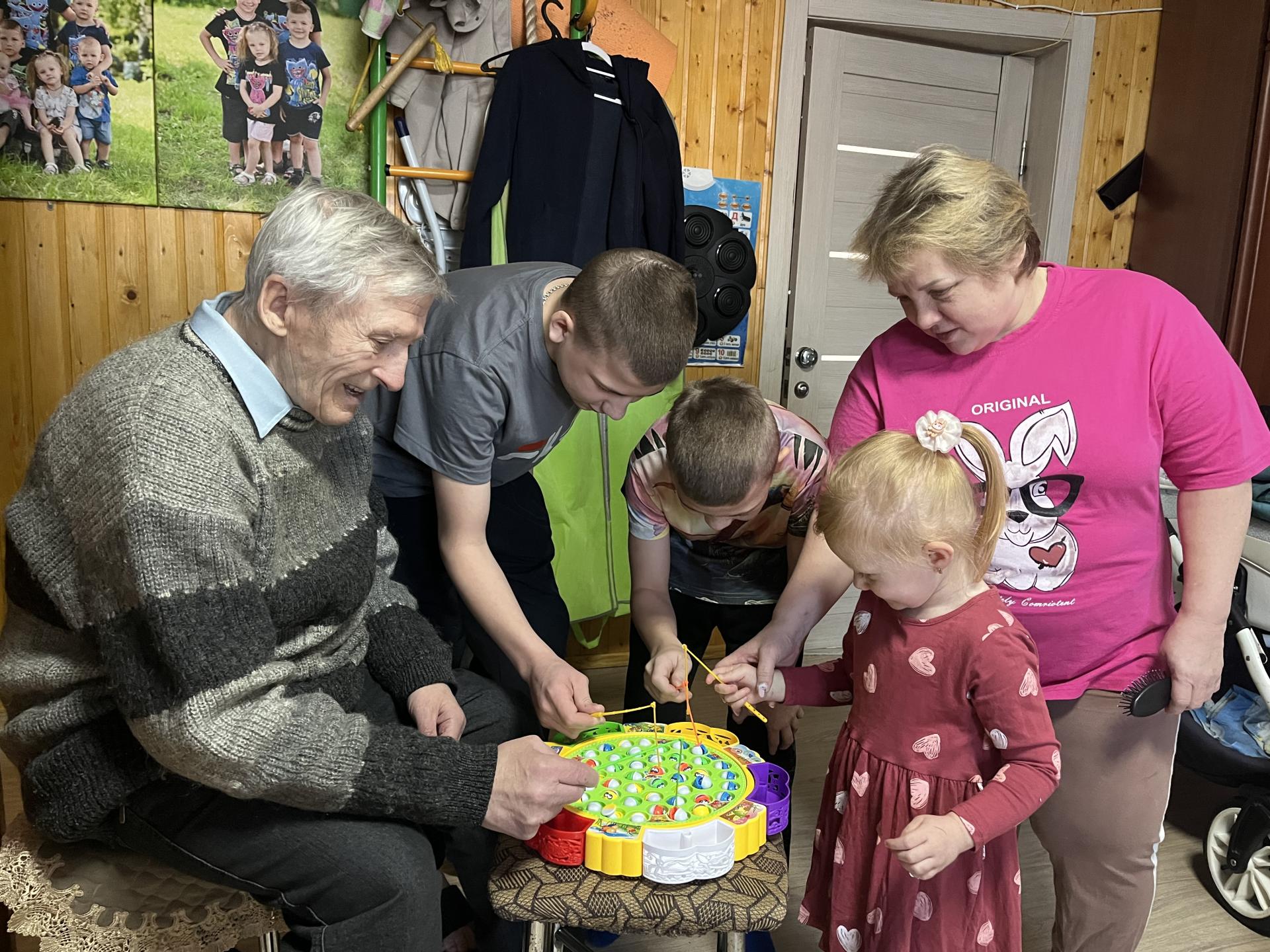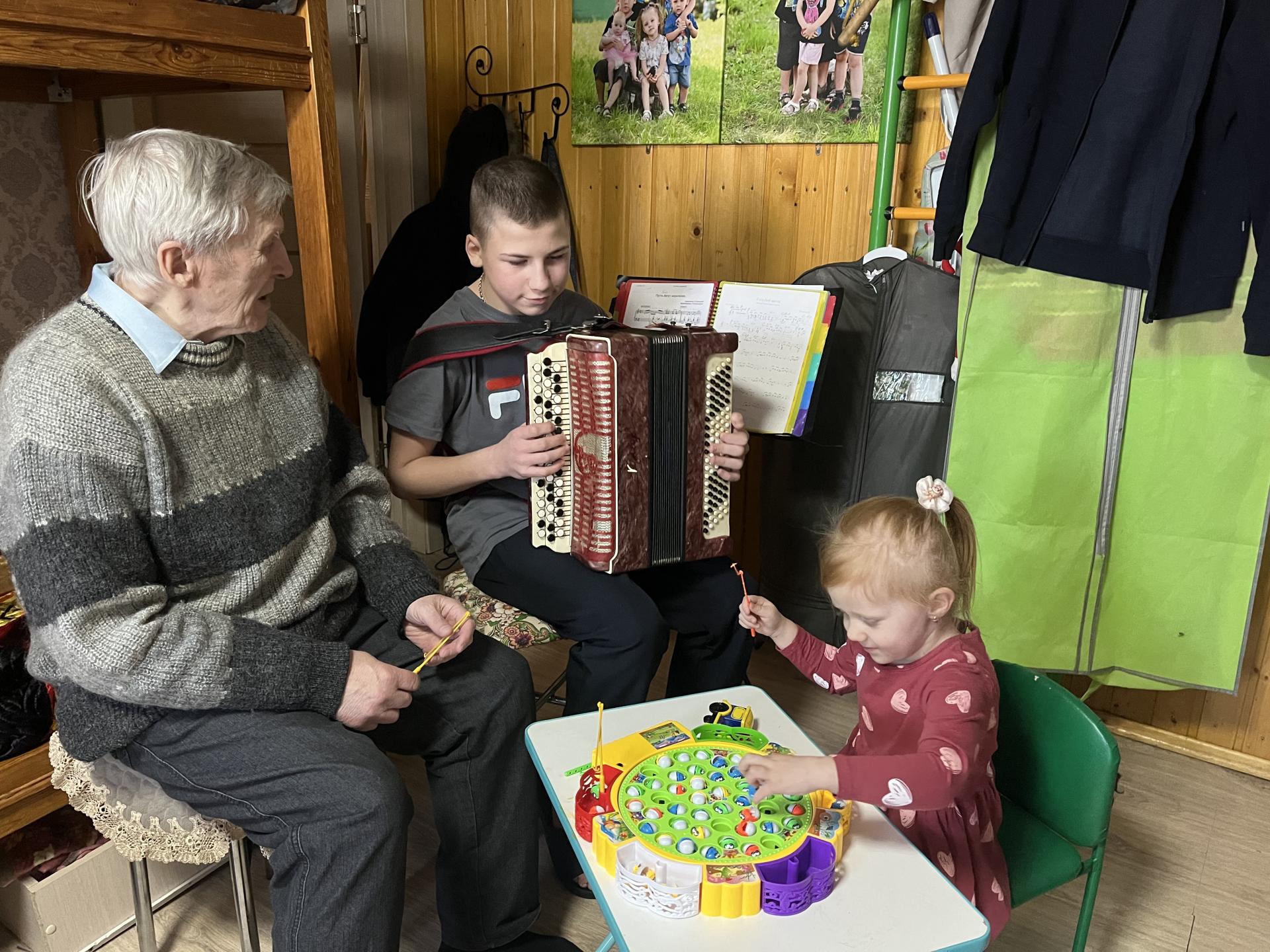 В рамках благотворительного марафона «Живи ярко-делай добро!» волонтер пансионата Павел Г. посетил многодетную семью и приехал не с пустыми руками, а с подарками. Жительница пансионата Жанна С., несмотря на то, что она инвалид по зрению ловко связала для деток носочки. А заводилой песен для детей стал баянист Павел Г., вместе они исполнили веселые песни, да и детки оказались не промах, показали свои умения и таланты!!! Работа мамы и бабушки в семье ни на миг не прекращается. Круглосуточно. А дети радуют: кто-то стишок выучил, кто-то песню, кто-то танец. Всё в радость!!