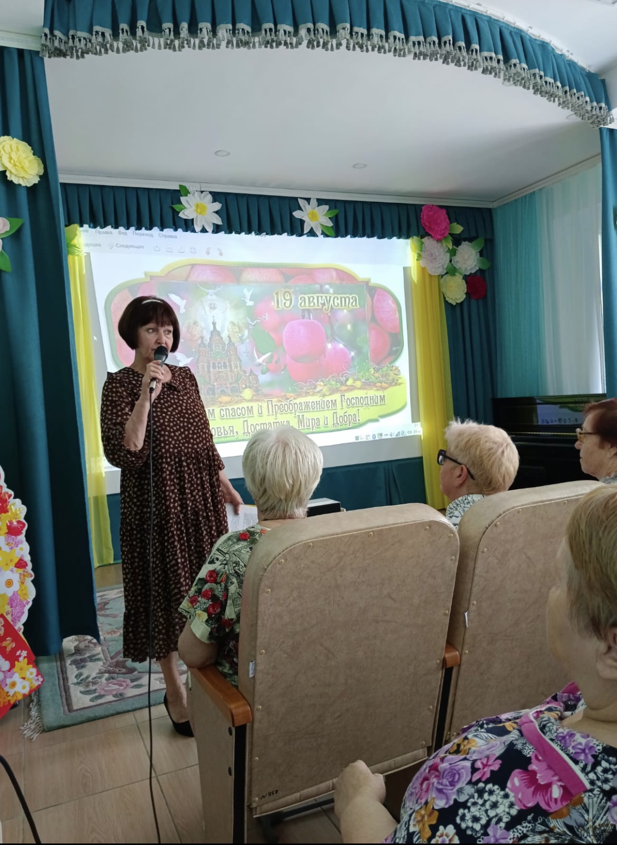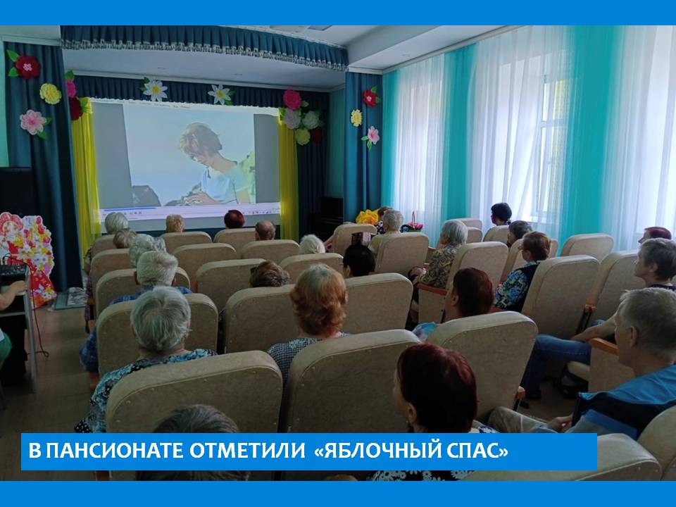 В этот праздничный день в актовом зале пансионата прошло познавательно - развлекательное мероприятие «Встречаем яблочный спас». В начале мероприятия участники ознакомились с историей праздника, узнали о его важности и значении, о народных традициях и приметах: пришел яблочный спас – ушло лето от нас; каков день в яблочный спас, такой будет и осень. Затем слушали и исполняли современные и народные песни и стихи, так же приняли участие в онлайн-викторине. Завершилось мероприятие угощением фруктами и яблочным соком. Праздник получился очень добрым, познавательным и весёлым. Масса приятных впечатлений осталось у жителей в этот праздничный день.