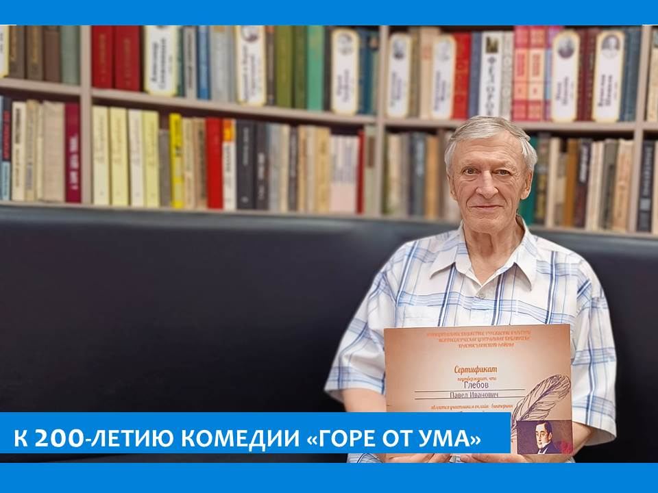 В 2024 году мы отмечаем 200-летний юбилей со дня создания бессмертной комедии Александра Сергеевича Грибоедова «Горе от ума». Эта пьеса и сегодня остается одним из самых актуальных и читаемых произведений русской литературы. Житель пансионата Павел Глебов принял участие в онлайн-викторине, прочитал отрывок из комедии и был отмечен сертификатом за участие.