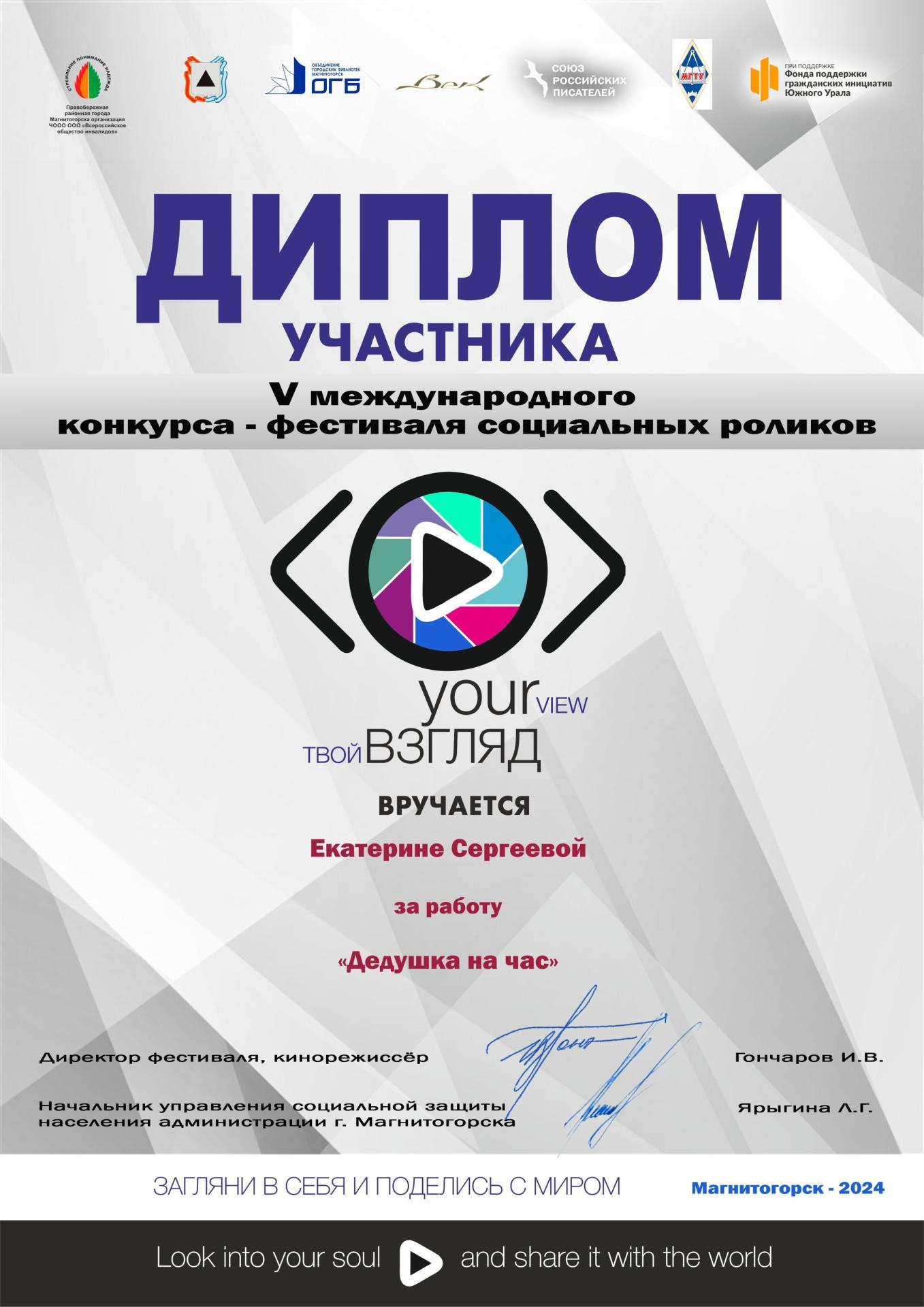Пансионат им.Е.П.Глинки активно тиражирует свои социальные практики. Пансионат принял участие в V Международном конкурсе-фестивале социальных роликов «Твой взгляд@ ЕВРОПА – АЗИЯ». За участие в фестивале – конкурсе пансионат был отмечен дипломами за практики – «Время жить», «Дедушка на час» и клуб добровольческой деятельности «ДоброSTAR».Это уникальный фестиваль социального кино, налаживающий духовную связь между самыми разными социальными группами. Организаторы Объединение городских библиотек г. Магнитогорск, Правобережное общество инвалидов г. Магнитогорска, Культурный центр «Век», Союз российских писателей, МГТУ им. Г. И. Носова, Академический лицей г. Магнитогорска, при поддержке Фонда гражданских инициатив Южного Урала.