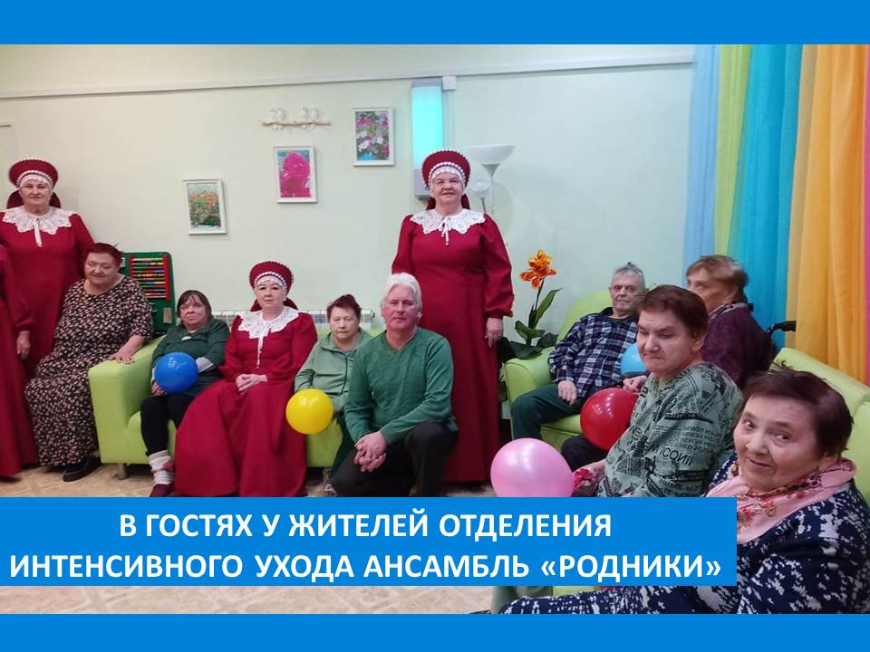 Отделение интенсивного ухода Вязниковского Пансионата (с. Сарыево) посетили давние друзья – песенный коллектив «Родники» Станковского сельского клуба с концертной программой «Нет ничего невозможного». Проживающие каждый раз с большой радостью и неподдельным интересом рады видеть этот коллектив в стенах своего дома. Концертная программа, в которой звучали любимые и дорогие сердцу песни, стала творческим подарком жителям отделения.