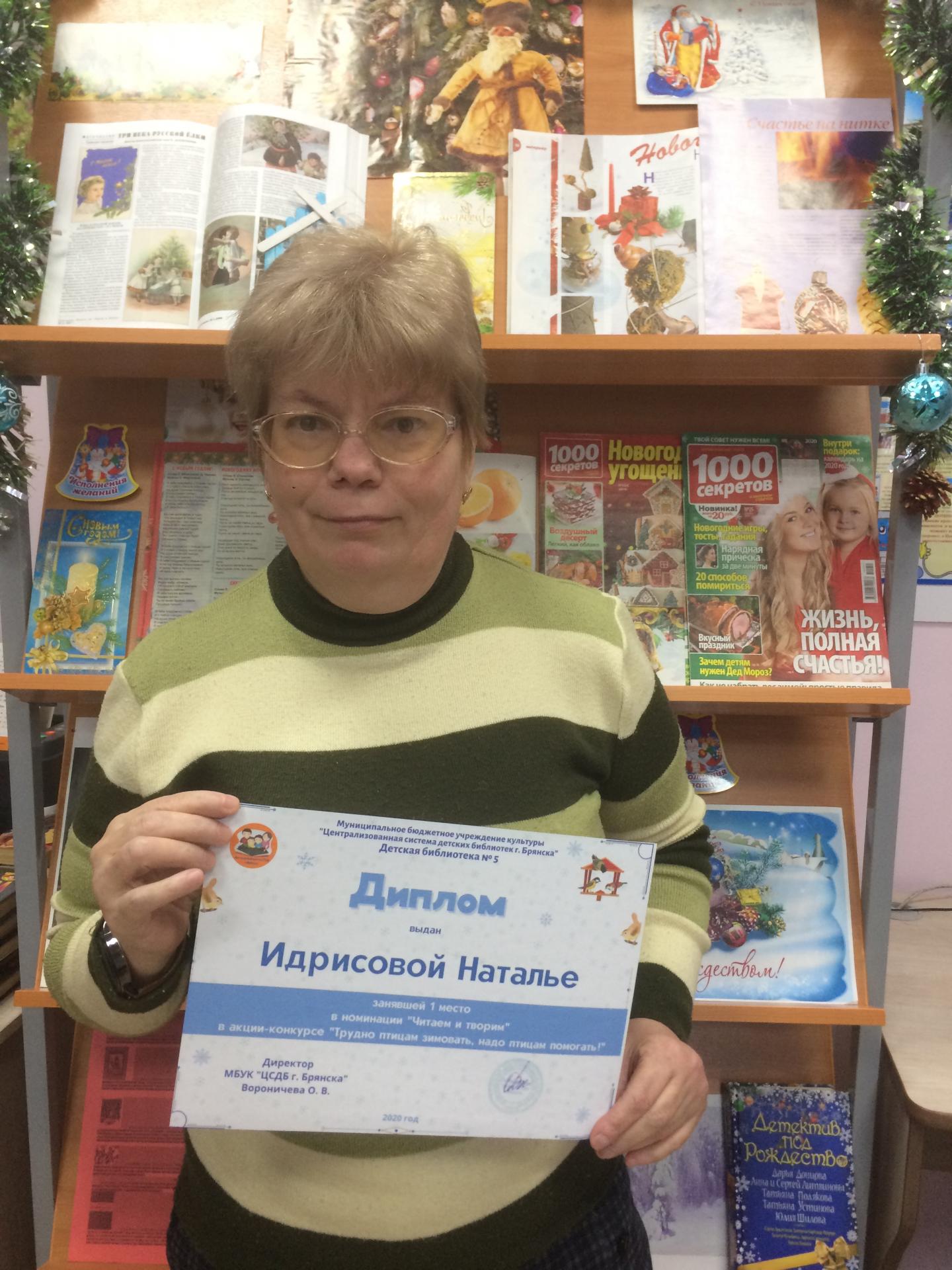 Жители нашего пансионата часто принимают участие в различных онлайн-акциях, фестивалях, конкурсах, викторинах, челленджах и среди них Наталья Идрисова. Сегодня для нее очередная победа, она заняла первое место в акции-конкурсе «Трудно птицам зимовать, надо птицам помогать» в номинации «Читаем и творим» и награждена Дипломом.